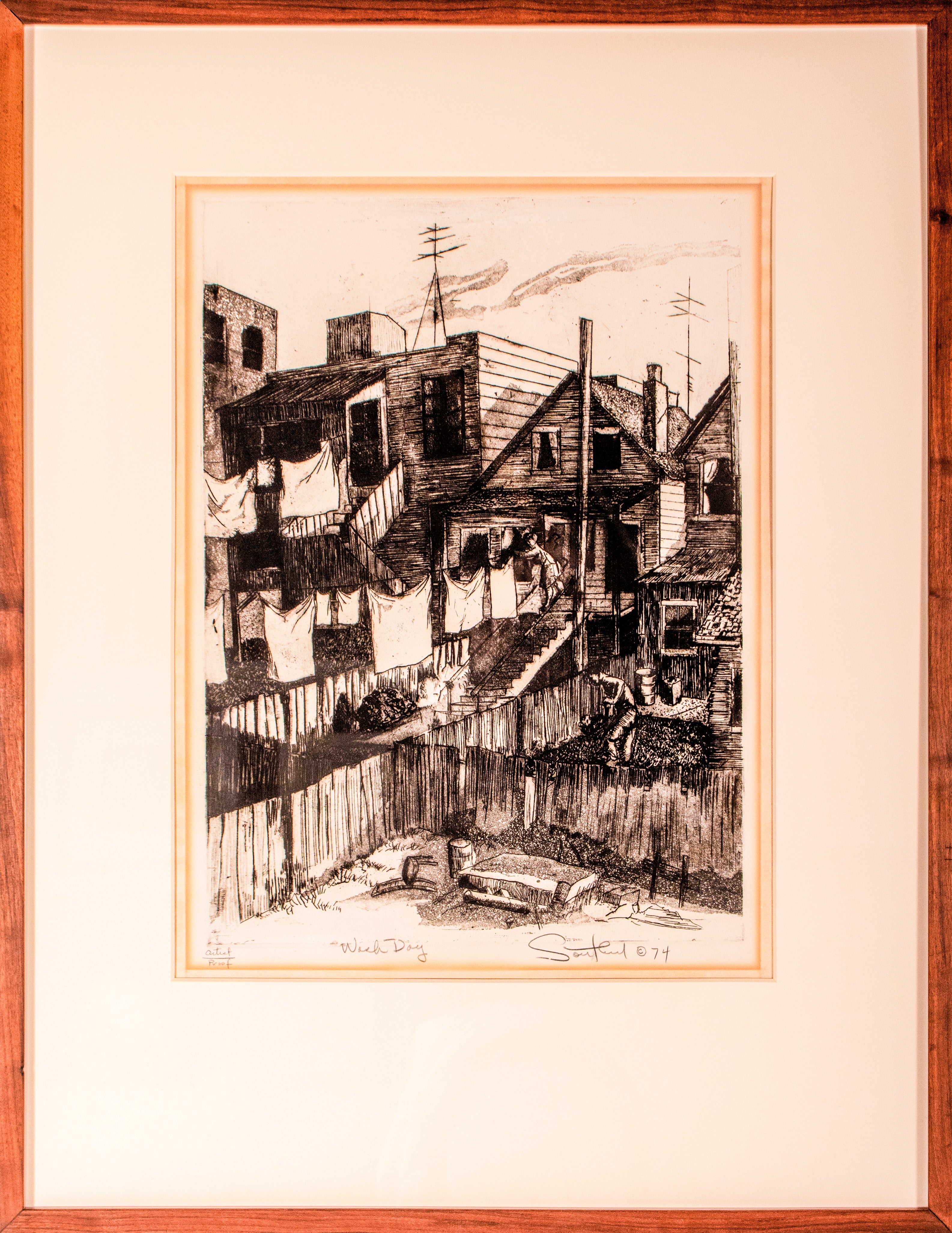 Entitled Wash Day, this 1970s etching on paper San Francisco scene is by the artist James Bruce Southard (1912-2007). Southard was an American painter active from 1950 to 2006, working in New York and primarily California. He trained at the National Academy of Design, Les Beaux Arts Institute of Design, Art Students League of New York, and the Escuela de Pintura y Escultura, he studied with major figurative painters including Reginald Marsh, Robert Brackman and Federico Cantú. Working in egg tempera, oil, watercolor, and print media, Southard’s style evolved toward Impressionism (often plein air), with light as the unifying motif across locations from New York’s Hudson Valley to Mexico and the California coast, especially in works depicting mid-to-late 20th-century California. He exhibited widely in invitational shows, was represented by Maxwell Gallery in San Francisco and others from the 1970s through the 1990s, and held affiliations including Artists’ Equity—where he served as an officer—and the Graphic Arts Workshop. His work is held in collections such as the Achenbach Works on Paper (de Young Museum), the San Francisco Art Commission, the Yonkers Art Museum, and numerous private collections.