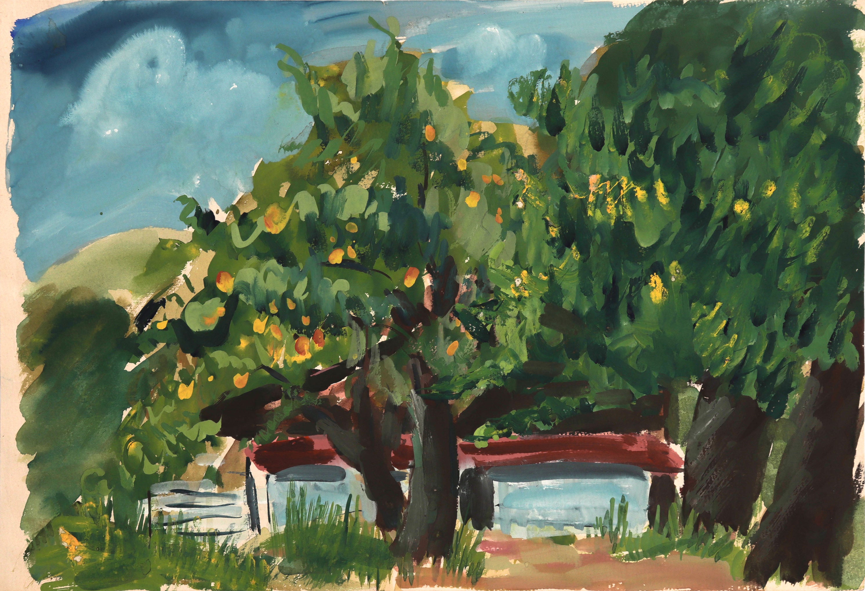 This mid to late 20th century gouache on paper landscape is by Chicago-based painter, photographer, and printmaker Barbara Lewis (1925-2008). Lewis studied at the Art Institute of Chicago (1943), University of Illinois at Chicago (1967-70), and the IIT Institute of Design (MFA in Printmaking, 1970-72). Through her mixed-media compositions, she explored Abstract Expressionism and Pop Art, often using imagery of Chicago and her travels to Europe and Northern Africa.