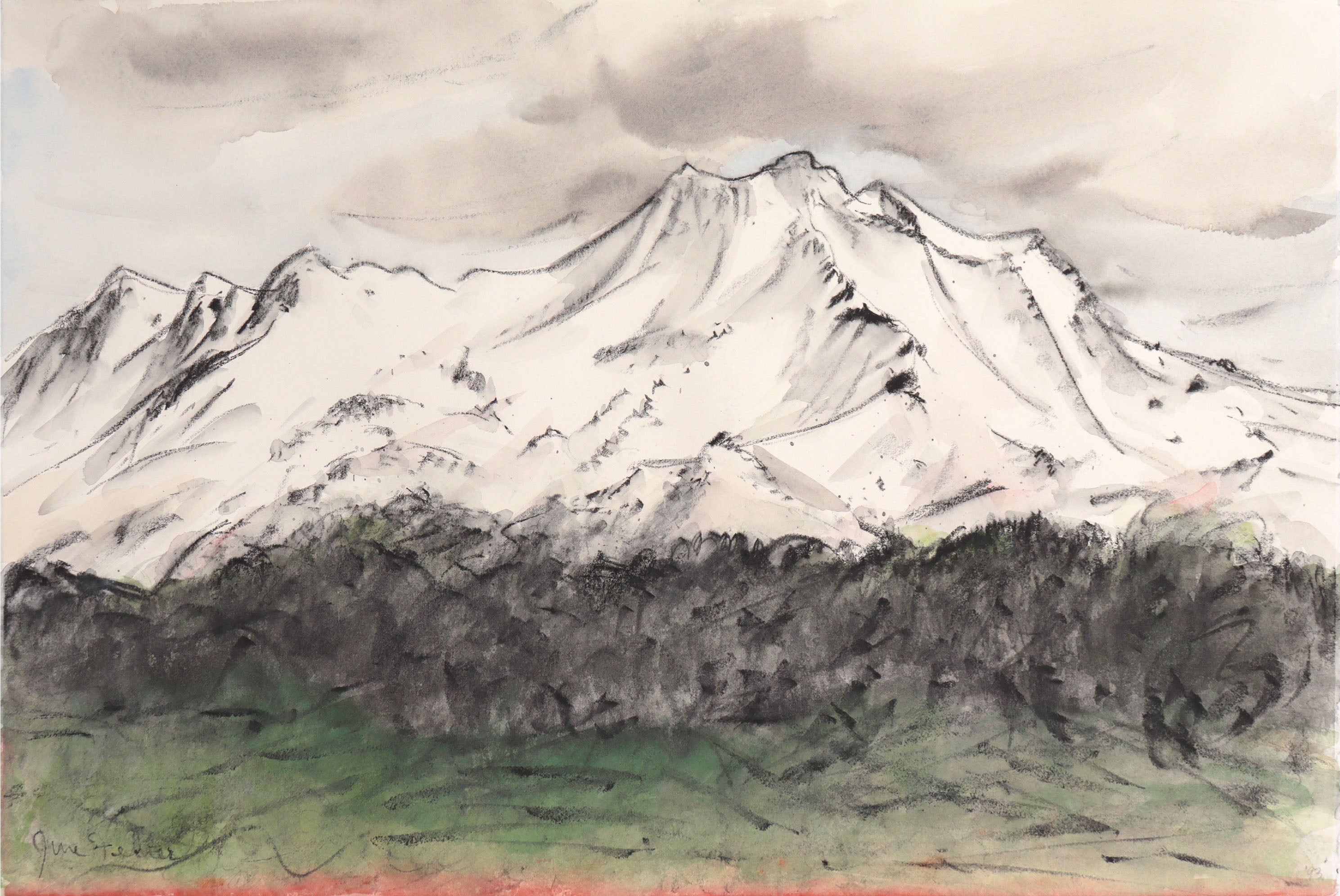 Entitled Mt. Shasta, this 1993 watercolor and charcoal on paper drawing is by Bay Area artist June Felter (1919–2019). Felter was a distinguished Oakland artist integral to the Bay Area figurative movement. Her artistic education began at the Oakland Art Institute from 1937 to 1940, followed by further studies at the California College of Arts and Crafts (1954–1958) and the San Francisco Art Institute (1960–1961). Her works are featured in prestigious collections, including SFMOMA, the National Gallery of Art, and the Oakland Museum of California.