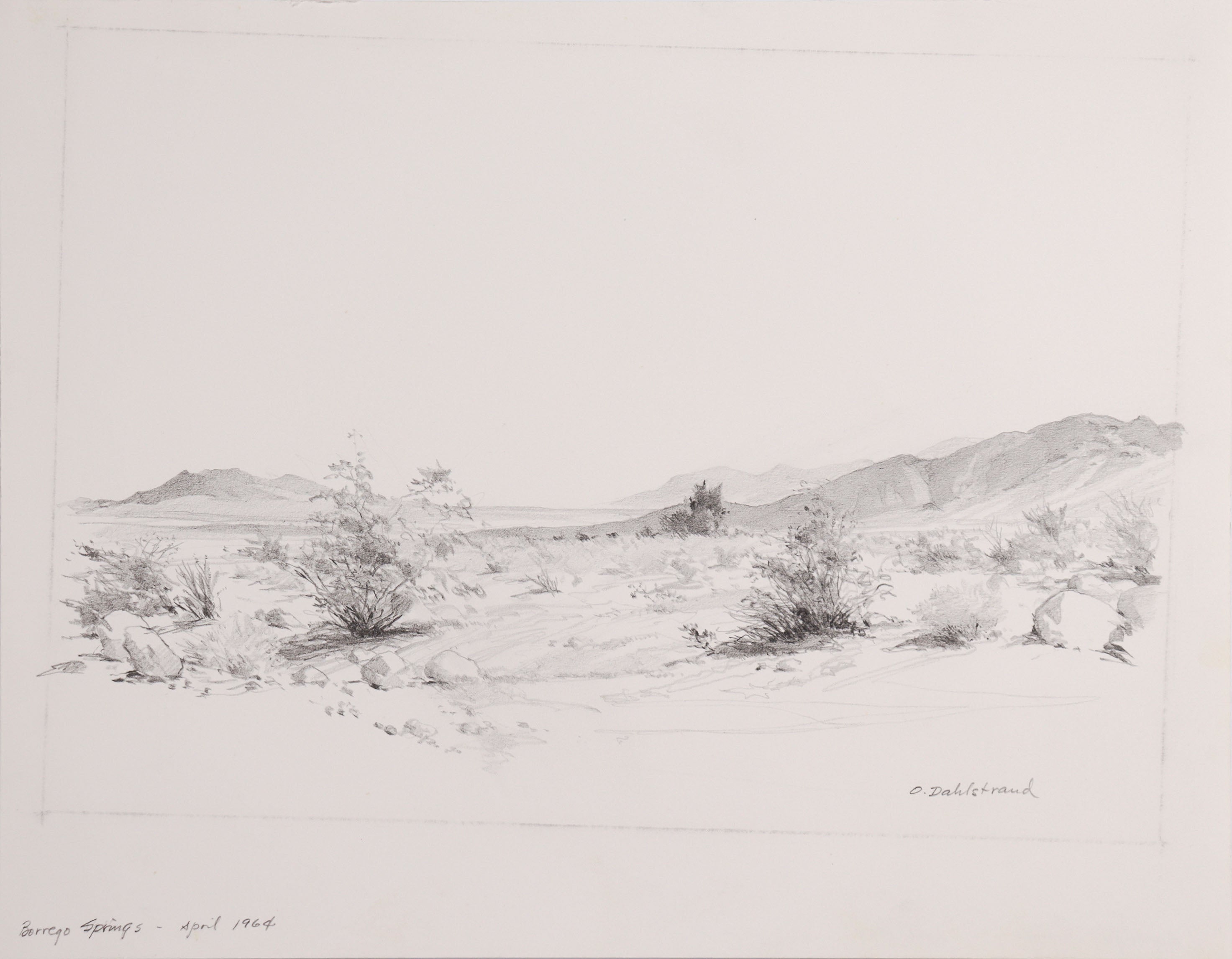 Entitled Borrego Springs, this April 1964 graphite on paper drawing is by Olof Dahlstrand (1916-2014) who joined Carmel Art Association in 1984. Dahlstrand (1916-2014) received a Bachelor of Architecture from Cornell University in 1939. He is considered a canonical figure in the conception and execution of significant works of the golden age of California Modernism. As a fine artist, he drew and painted throughout his life and then continuously after he retired in 1984. Exhibition highlights include: Milwaukee Art Institute, San Francisco Museum of Art, and the Monterey Peninsula Museum of Art. He joined the Carmel Art Association in 1984. He was also a member of the Board of Trustees for Monterey Peninsula Museum of Art. An avid outdoorsman and explorer of rural California, much of his work skillfully captures the natural beauty of the West Coast with a stunning sense of realism and accuracy. Late in life he turned to abstraction, and his compositions reflect an architect’s interest in geometry and order.