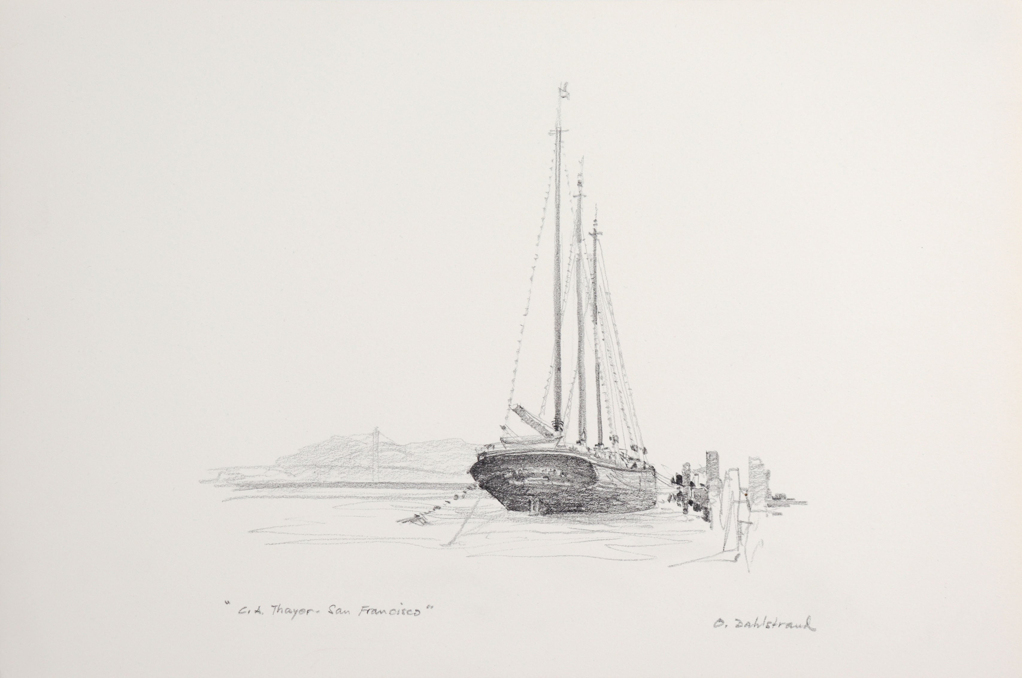 Entitled CA Thayer, San Francisco, this mid 20th century graphite on paper drawing is by Olof Dahlstrand (1916-2014) who joined Carmel Art Association in 1984. Dahlstrand (1916-2014) received a Bachelor of Architecture from Cornell University in 1939. He is considered a canonical figure in the conception and execution of significant works of the golden age of California Modernism. As a fine artist, he drew and painted throughout his life and then continuously after he retired in 1984. Exhibition highlights include: Milwaukee Art Institute, San Francisco Museum of Art, and the Monterey Peninsula Museum of Art. He joined the Carmel Art Association in 1984. He was also a member of the Board of Trustees for Monterey Peninsula Museum of Art. An avid outdoorsman and explorer of rural California, much of his work skillfully captures the natural beauty of the West Coast with a stunning sense of realism and accuracy. Late in life he turned to abstraction, and his compositions reflect an architect’s interest in geometry and order.