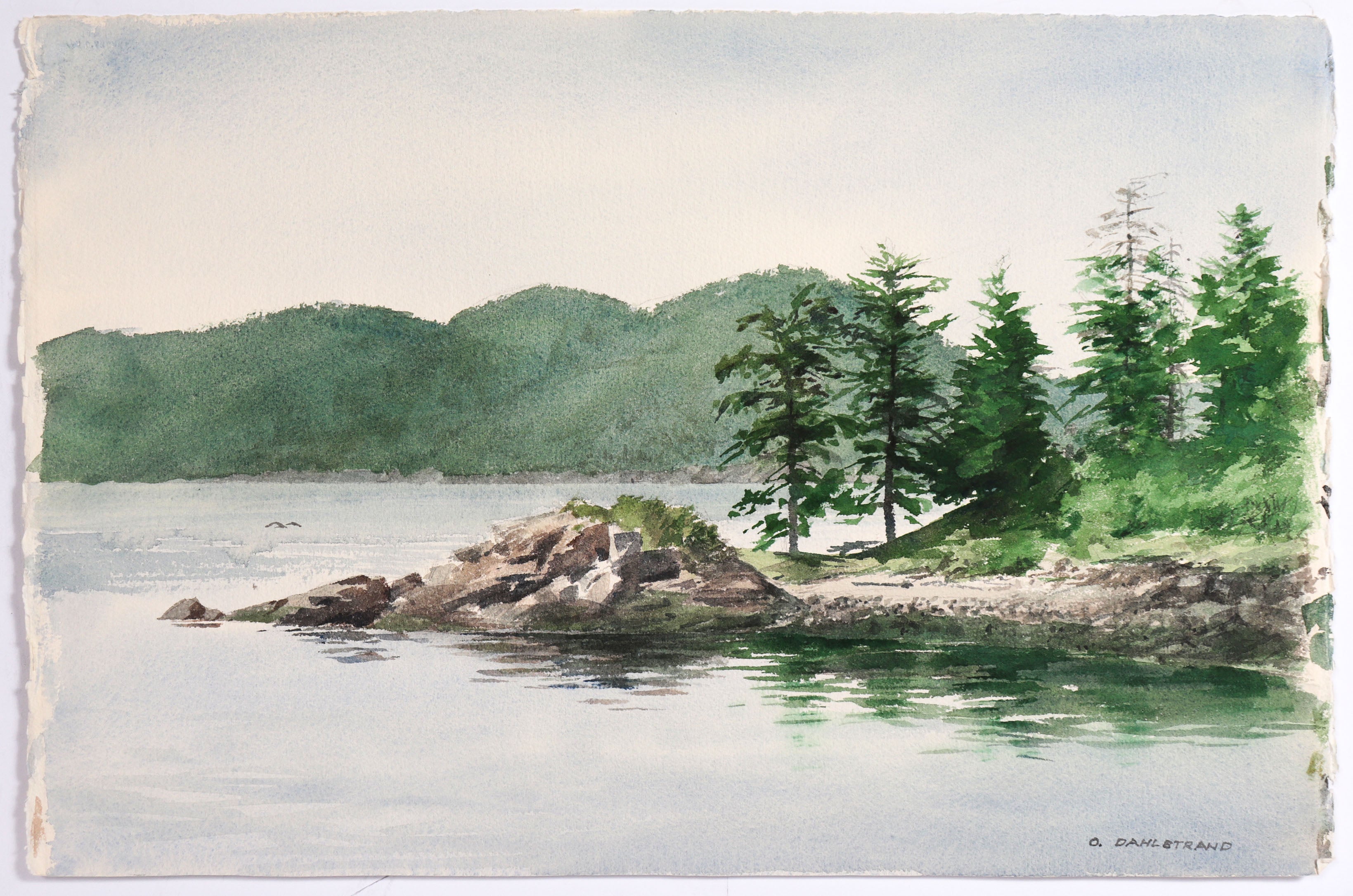 Entitled Point at Doe Island, this 1989 watercolor on paper drawing is by Olof Dahlstrand (1916-2014) who joined Carmel Art Association in 1984. Dahlstrand (1916-2014) received a Bachelor of Architecture from Cornell University in 1939. He is considered a canonical figure in the conception and execution of significant works of the golden age of California Modernism. As a fine artist, he drew and painted throughout his life and then continuously after he retired in 1984. Exhibition highlights include: Milwaukee Art Institute, San Francisco Museum of Art, and the Monterey Peninsula Museum of Art. He joined the Carmel Art Association in 1984. He was also a member of the Board of Trustees for Monterey Peninsula Museum of Art. An avid outdoorsman and explorer of rural California, much of his work skillfully captures the natural beauty of the West Coast with a stunning sense of realism and accuracy. Late in life he turned to abstraction, and his compositions reflect an architect’s interest in geometry and order.