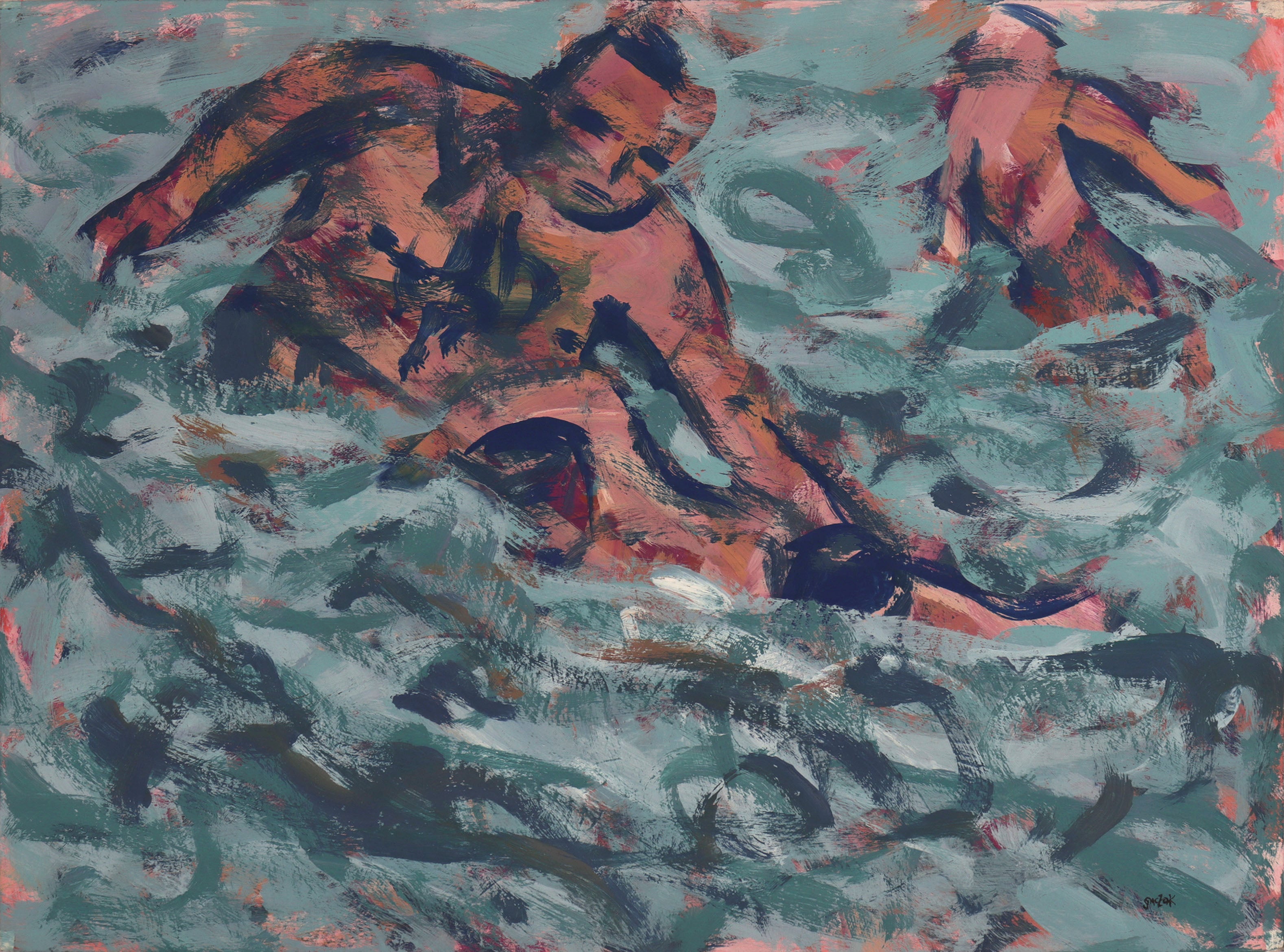 Entitled Swimming Lessons, this c. 1985 gouache on paper board abstract is by artist Mark Symczak (1954-2015). Symczak was a Pittsburgh-born painter whose 40-year career was cut too short. Educated at the Art Institute of Pittsburgh, his early work reflected the industrial landscapes of his youth, blending photo-realism with surrealist blur and density. After relocating to New York in 1982, his subject matter shifted toward human figures and urban life, deeply influenced by his work in theater set design in New York. Throughout the mid-1980s and 1990s, human subjects dominated the canvas. Scenes of people living in a tight metropolis were often depicted in a theater or nightclub setting. Despite their fragmented, cubist-like forms, the figures come together with the unity of a thoughtfully arranged ensemble. The excited energy of the stage and the warmth of collaboration can be felt in these scenes, even as his style turns toward the flat and angular line, often associated with the work of Max Beckmann. His late-career “Birds” series—formed through ink and collage—evokes quiet introspection and was inspired in part by his mother’s love of birds and his own experience with illness. Symczak’s work has been exhibited in galleries throughout the U.S., and remains notable for its expressive use of color, evolving visual language, and the artist’s curiosity about the worlds around him.