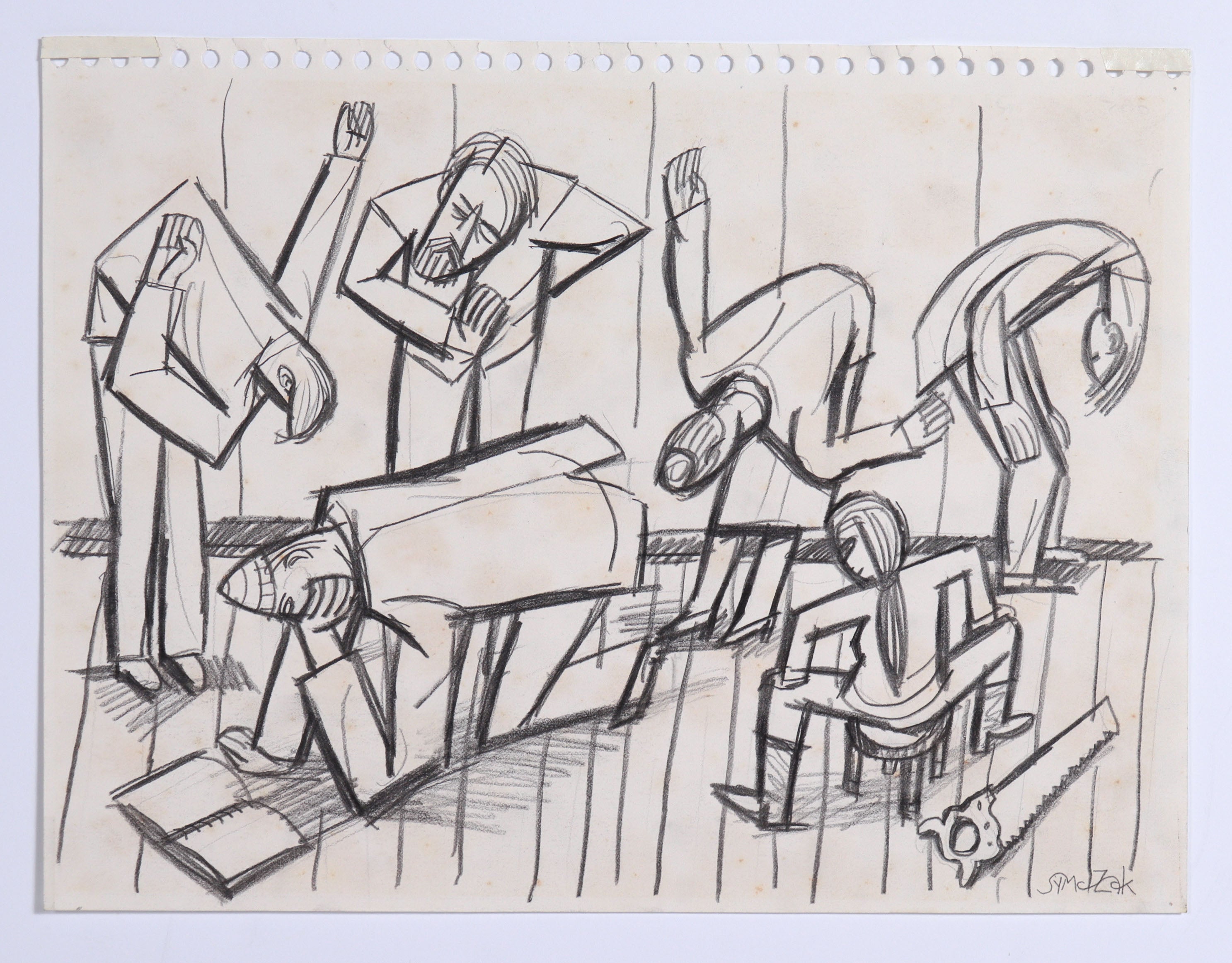 Entitled Reading Through I, Rehearsal Series, this c. 1991 graphite on paper drawing is by artist Mark Symczak (1954-2015). Symczak was a Pittsburgh-born painter whose 40-year career was cut too short. Educated at the Art Institute of Pittsburgh, his early work reflected the industrial landscapes of his youth, blending photo-realism with surrealist blur and density. After relocating to New York in 1982, his subject matter shifted toward human figures and urban life, deeply influenced by his work in theater set design in New York. Throughout the mid-1980s and 1990s, human subjects dominated the canvas. Scenes of people living in a tight metropolis were often depicted in a theater or nightclub setting. Despite their fragmented, cubist-like forms, the figures come together with the unity of a thoughtfully arranged ensemble. The excited energy of the stage and the warmth of collaboration can be felt in these scenes, even as his style turns toward the flat and angular line, often associated with the work of Max Beckmann. His late-career “Birds” series—formed through ink and collage—evokes quiet introspection and was inspired in part by his mother’s love of birds and his own experience with illness. Symczak’s work has been exhibited in galleries throughout the U.S., and remains notable for its expressive use of color, evolving visual language, and the artist’s curiosity about the worlds around him.