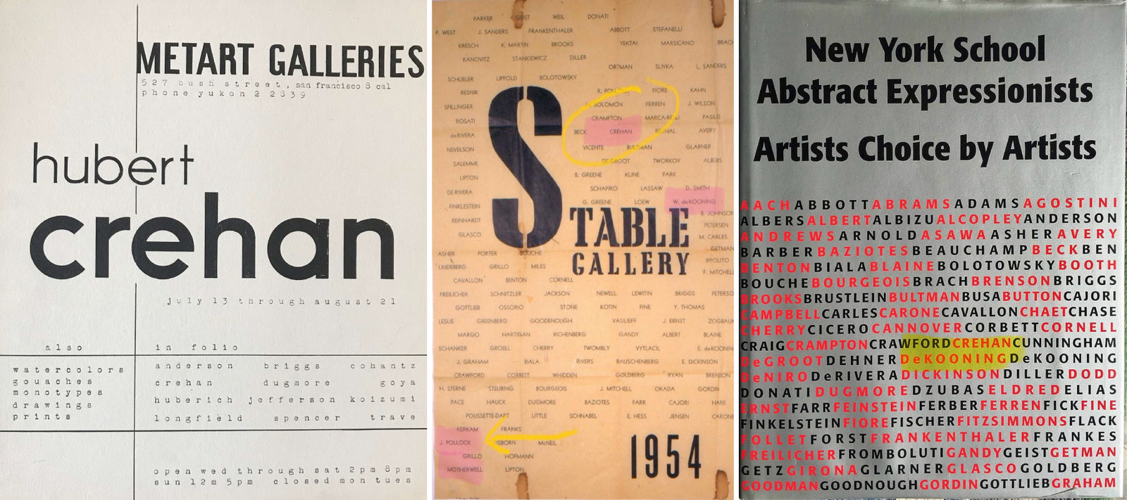 Left: Handbill for Crehan's 1949 SF solo show. Center: Crehan featured in a N.Y. AbEx show with the likes of Pollock, de Kooning and Motherwell. Right: Crehan on the cover of a seminal AbEx book.