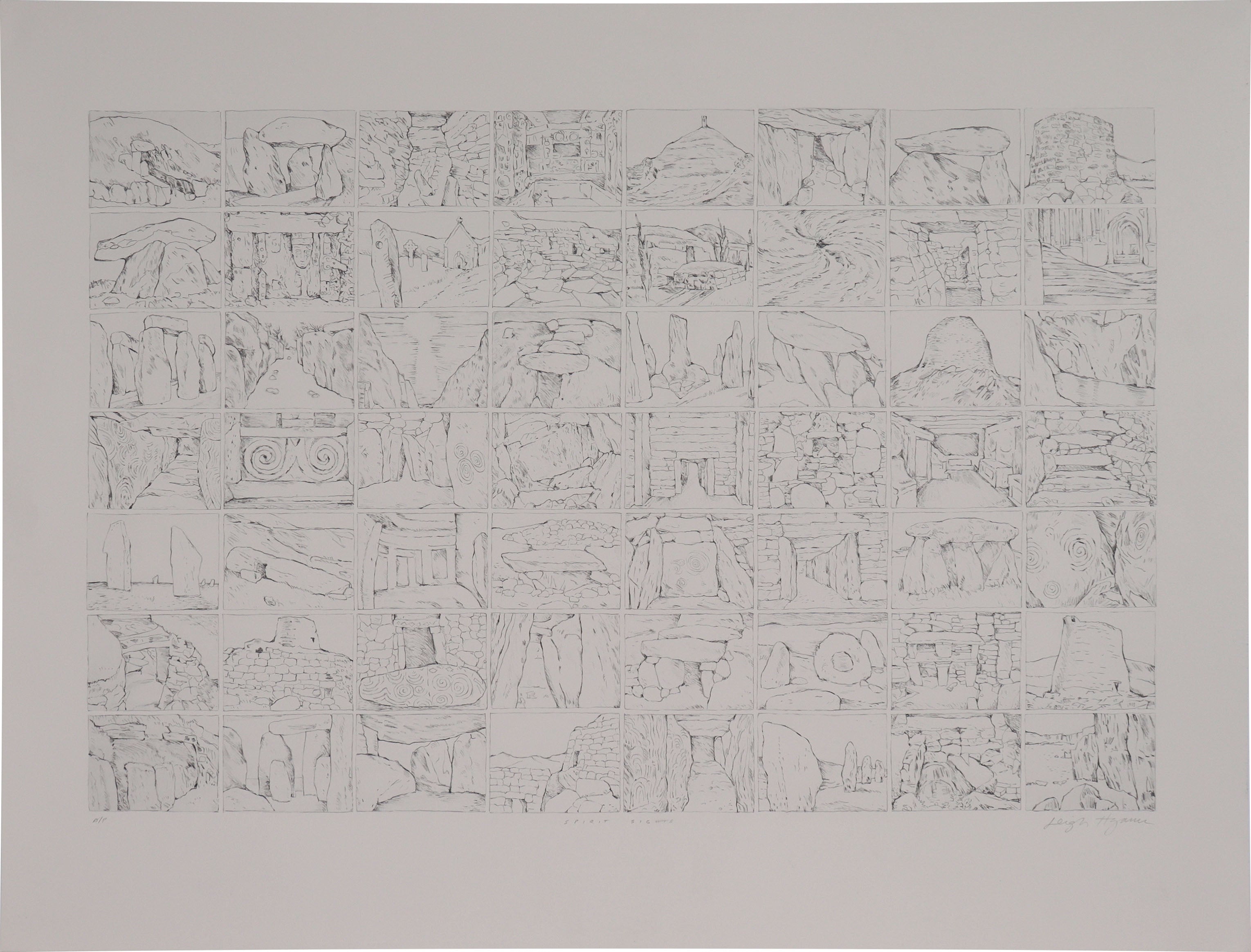Entitled Spirit Sights, this late 20th century graphite on paper storyboard drawing is by the artist Leigh Hyams (1926-2013). Leigh Hyams, aka Martha Mae Nickerson, Martha Bolling, and Martha Hyams, was an acclaimed painter and teacher whose career spanned several decades and continents. Based in San Francisco from 1974 to 2000, she later made her home in San Miguel de Allende, Mexico, where she continued to paint and teach until her passing.