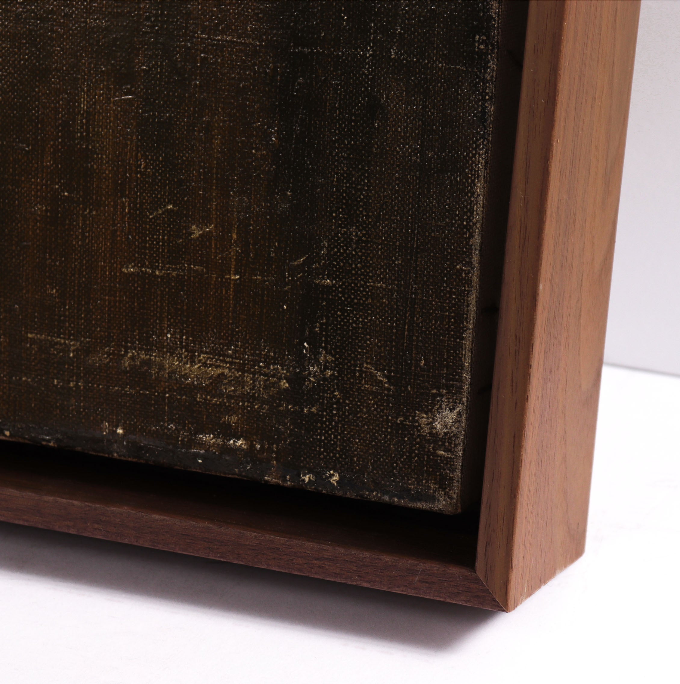 Estate stamped on the back. Fair vintage condition; some small chips of paint missing, edges of canvas slightly distressed. Framed in a contemporary wood floater frame with an oiled walnut finish.