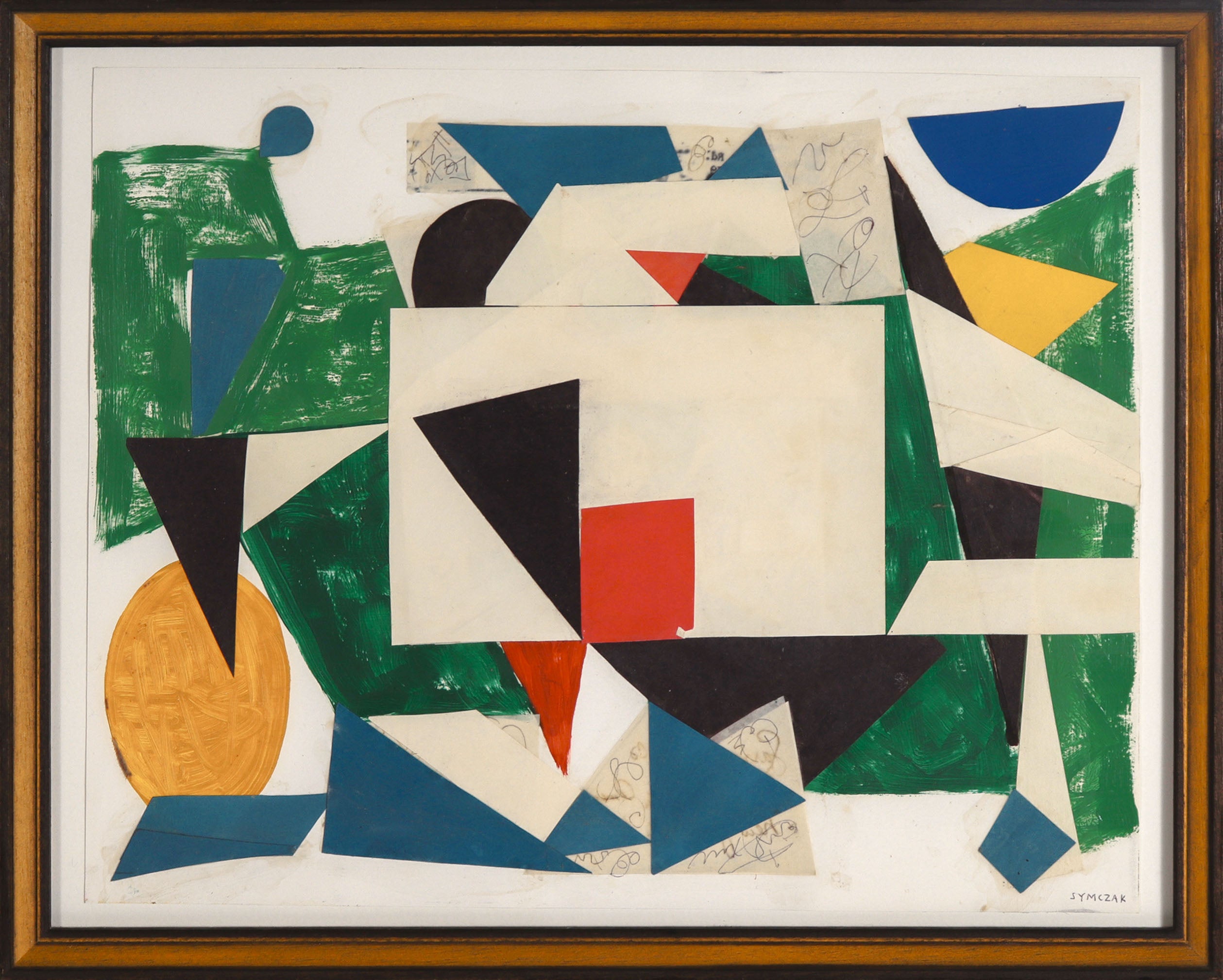 Entitled Geo Man with Scribbles, this c. 1987 collage on paper abstract is by artist Mark Symczak (1954-2015). Symczak was a Pittsburgh-born painter whose 40-year career was cut too short. Educated at the Art Institute of Pittsburgh, his early work reflected the industrial landscapes of his youth, blending photo-realism with surrealist blur and density. After relocating to New York in 1982, his subject matter shifted toward human figures and urban life, deeply influenced by his work in theater set design in New York. Throughout the mid-1980s and 1990s, human subjects dominated the canvas. Scenes of people living in a tight metropolis were often depicted in a theater or nightclub setting. Despite their fragmented, cubist-like forms, the figures come together with the unity of a thoughtfully arranged ensemble. The excited energy of the stage and the warmth of collaboration can be felt in these scenes, even as his style turns toward the flat and angular line, often associated with the work of Max Beckmann. His late-career “Birds” series—formed through ink and collage—evokes quiet introspection and was inspired in part by his mother’s love of birds and his own experience with illness. Symczak’s work has been exhibited in galleries throughout the U.S., and remains notable for its expressive use of color, evolving visual language, and the artist’s curiosity about the worlds around him.