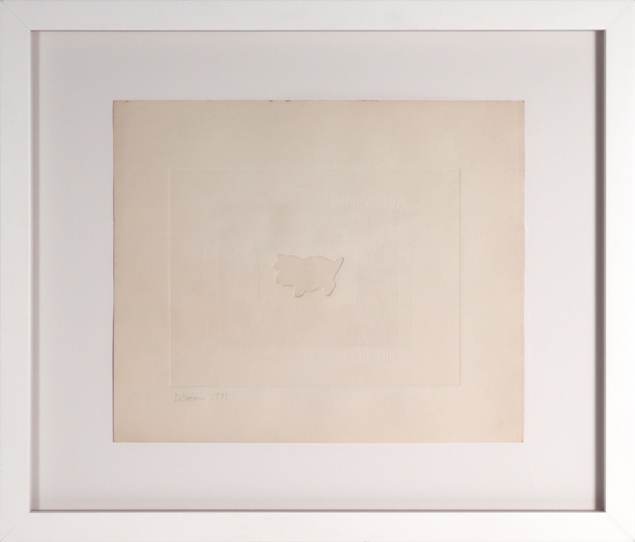 This 1971 blind embossed (no ink is used) paper abstract is by New York and long-time Emeryville painter, sculptor and educator Joseph DiStefano (1940-2020). A prolific and highly-varied artist, he was known for merging neo-classical forms, bold brushwork and symbolic imagery. His paintings bring to mind the work of Robert Rauschenberg, Jackson Pollock and Gerhard Richter. He earned his BFA from the Rochester Institute of Technology and an MFA from Yale University’s School of Art and Architecture. DiStefano taught woodworking and advanced sculpture at leading institutions including Virginia Commonwealth University, the California College of Arts and Crafts, and the University of California, Berkeley. His work was featured in solo exhibitions at venues such as Museo Italiano in San Francisco, the Mackler Gallery in Philadelphia, and the Pro Arts Gallery in Oakland. DiStefano's art has been acquired by a range of public and private collectors, including the Eastman Kodak Corporation, the State of California, and the City of Emeryville.