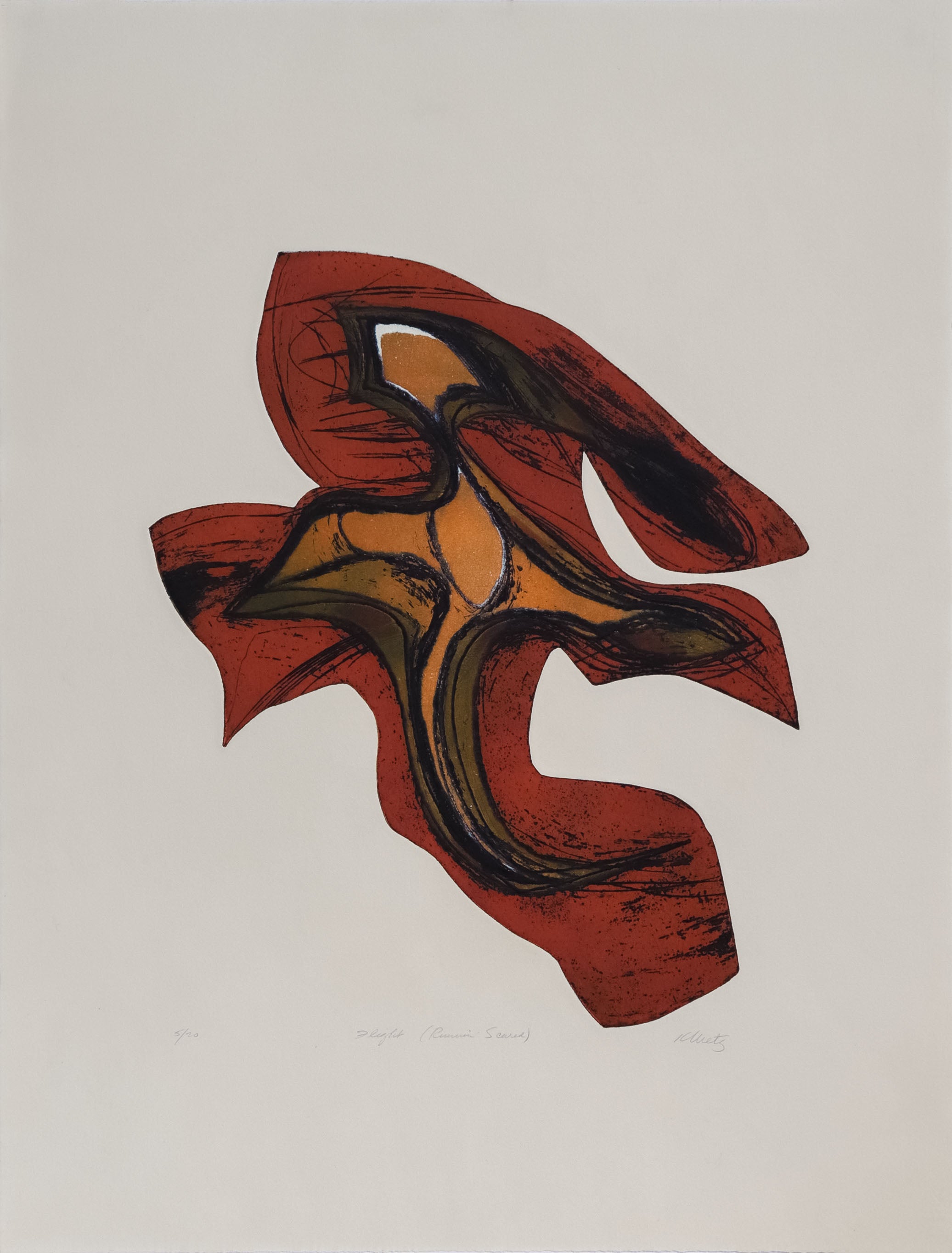 Entitled Flight (Runnin' Scared), this mid 20th century etching on paper is by New York painter and printmaker Kathryn (Kay) Metz (1932-2018). Metz came of age as a painter in New York City in the 1960s studying abstract expressionism, which subsequently informed all her work - from her intimate plein air paintings, to her vivid watercolors and arresting woodcuts and etchings. She received her BFA from Bowling Green State University in Ohio and her MFA from UCLA. Her teaching experience began in 1964 at Phoenix College in Arizona. She left there in 1966 to go to Paris and study at Atelier 17, the celebrated print studio established by Stanley William Hayter. She continued her studies in New York City, including independent studies with Philip Guston and Robert Blackburn. Soon she was asked to establish the printmaking department at the University of California, Santa Cruz in 1971, and remained there until her retirement in 1992. In 2019 she was posthumously recognized with a solo exhibition at the Triton Museum of Art. Her works are held in numerous major collections, including: the New York Public Library, the Library of Congress, The Phoenix Art Museum, the Fresno Art Museum, and the Monterey Museum of Art, among others. Her work is often summarized as the study of light in a landscape.