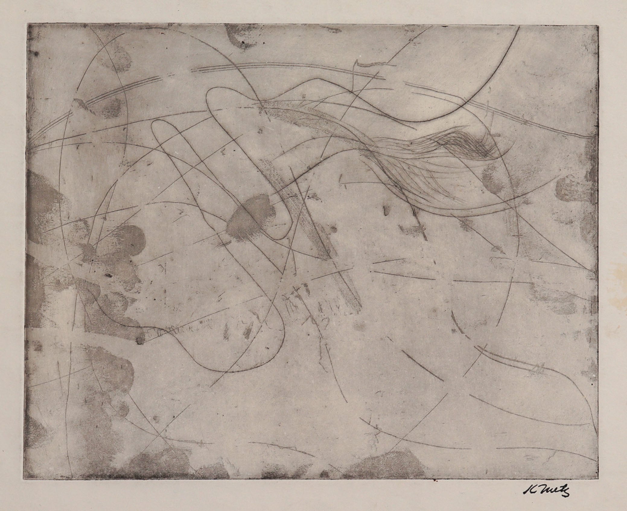 This 1966 etching on paper is by New York painter and printmaker Kathryn (Kay) Metz (1932-2018). Metz came of age as a painter in New York City in the 1960s studying abstract expressionism, which subsequently informed all her work - from her intimate plein air paintings, to her vivid watercolors and arresting woodcuts and etchings. She received her BFA from Bowling Green State University in Ohio and her MFA from UCLA. Her teaching experience began in 1964 at Phoenix College in Arizona. She left there in 1966 to go to Paris and study at Atelier 17, the celebrated print studio established by Stanley William Hayter. She continued her studies in New York City, including independent studies with Philip Guston and Robert Blackburn. Soon she was asked to establish the printmaking department at the University of California, Santa Cruz in 1971, and remained there until her retirement in 1992. In 2019 she was posthumously recognized with a solo exhibition at the Triton Museum of Art. Her works are held in numerous major collections, including: the New York Public Library, the Library of Congress, The Phoenix Art Museum, the Fresno Art Museum, and the Monterey Museum of Art, among others. Her work is often summarized as the study of light in a landscape.