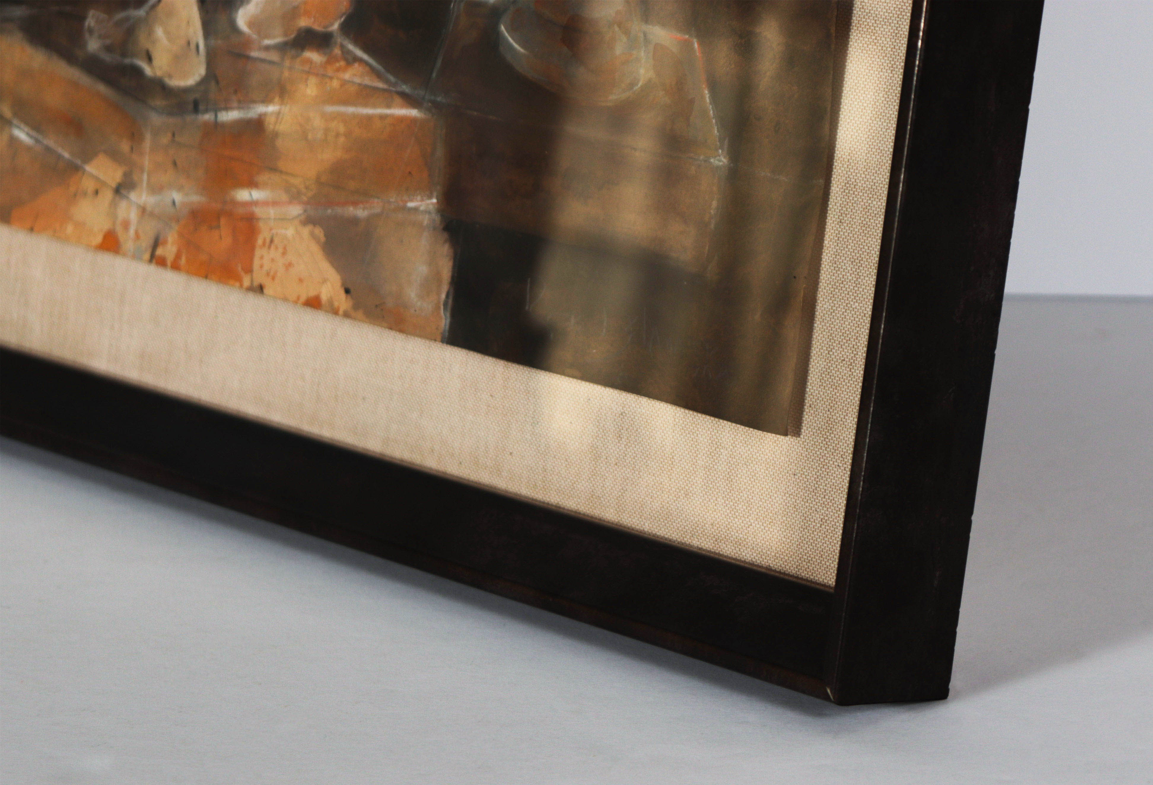 Signed and dated lower right. Signed, dated and titled on the back. Excellent condition. Framed floating in a contemporary wood frame with a deep angled face and distressed metallic finish using archival linen matting and clear spacers behind conservation clear glass.