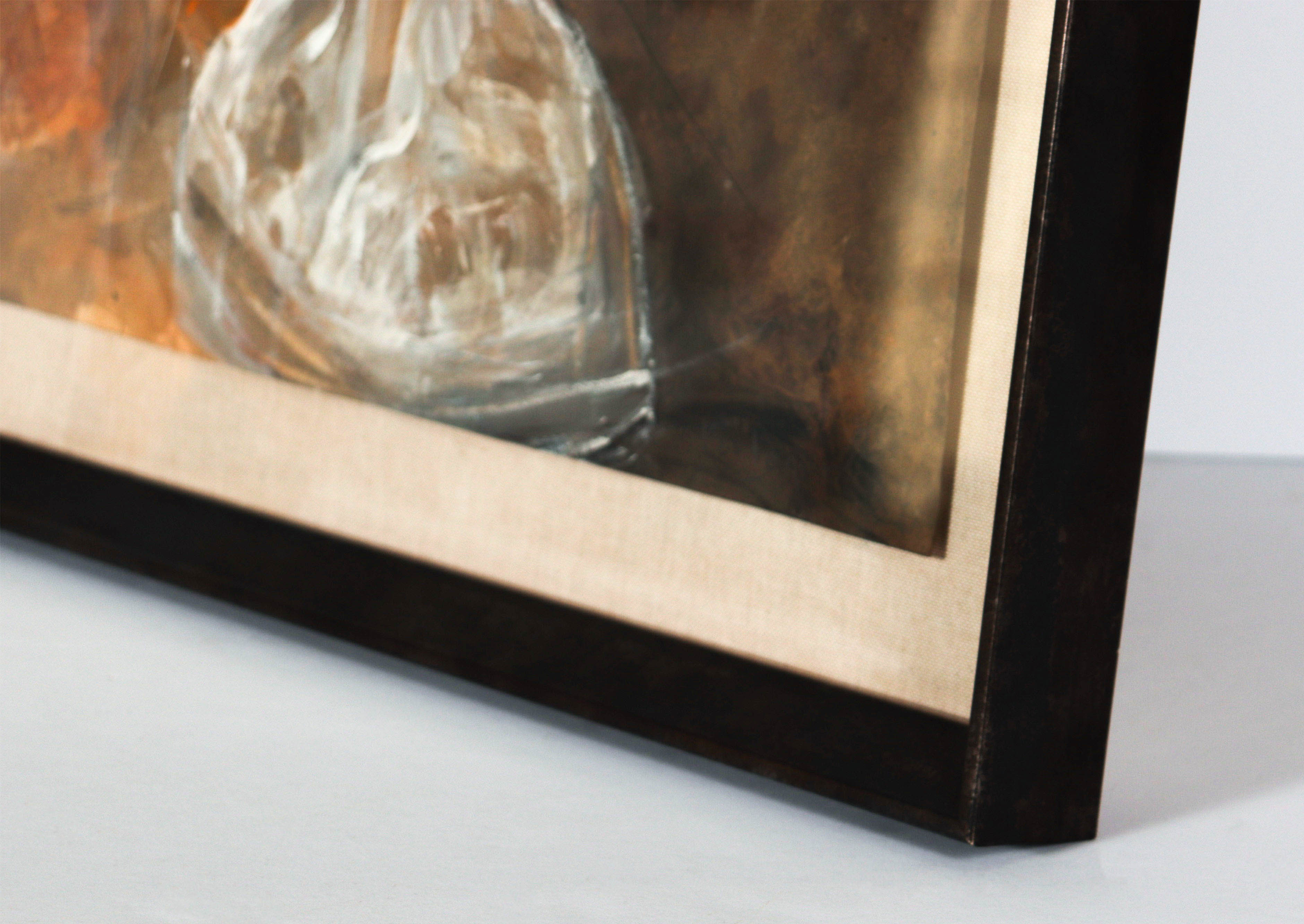 Signed and dated lower right. Signed, dated and titled on the back. Excellent condition. Framed floating in a contemporary wood frame with a deep angled face and distressed metallic finish using archival linen matting and clear spacers behind conservation clear glass.