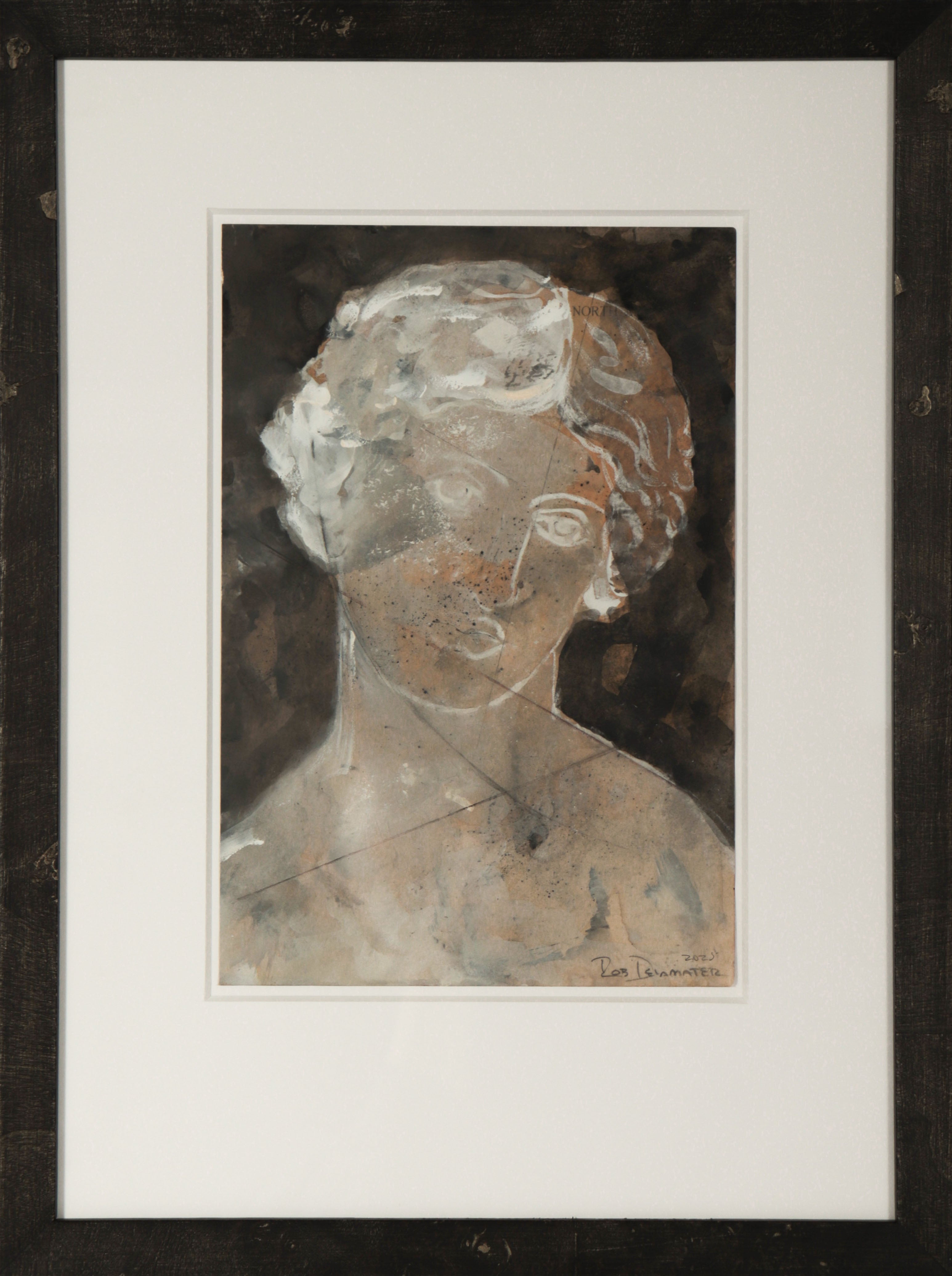 Entitled Greco-Roman Bust IV, this 2025 gouache and mixed media figure on antique paper is by San Francisco artist and Lost Art Salon co-owner Rob Delamater (b.1966). Delamater creates abstract compositions that evoke organic shapes and motifs from the natural world. His works are created using various forms of printmaking, painting, and collage.