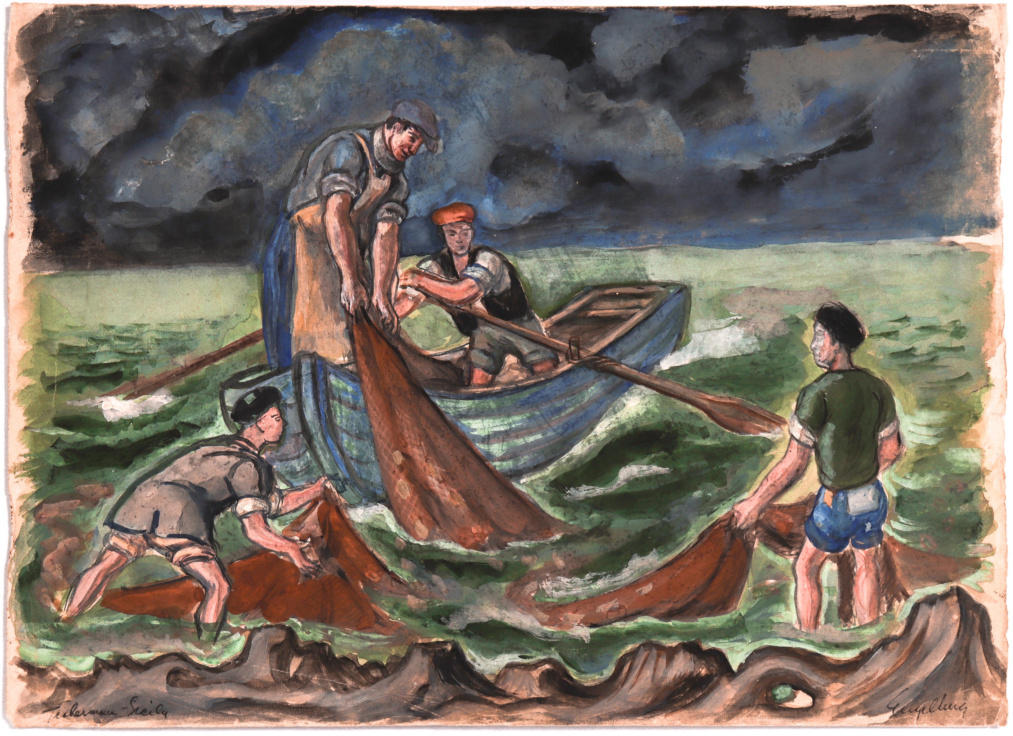Entitled Fishermen–Sicily, this 1940's gouache on paper people scene is by Sydney Engelberg (1912-1997). Engelberg was a painter and illustrator who primarily worked within the American Scene tradition during the first half of the 20th century. He blended aspects of Regionalism, Social Realism, and occasionally Magic Realism to create uniquely American narratives. Active during the peak of American Scene painting, Engelberg was a contemporary—and at times a student—of the movement’s key artist, Thomas Hart Benton (1889–1975). Engelberg combined the more conservative Regionalism with elements of the left-leaning Social Realism, while also occasionally incorporating the surreal, dreamlike qualities of Magic Realism. Most of Engelberg’s work was created during his active service in WWII and through his illustrations for The New Yorker magazine, both before and after the war. However, like the mischievous harlequins that appear and disappear throughout his oeuvre, Engelberg hid a secret: he was a closeted gay man until he met his lifelong partner in the early 1950s. His hidden identity would influence how he experienced and depicted the "American Scene," both at home and at war.