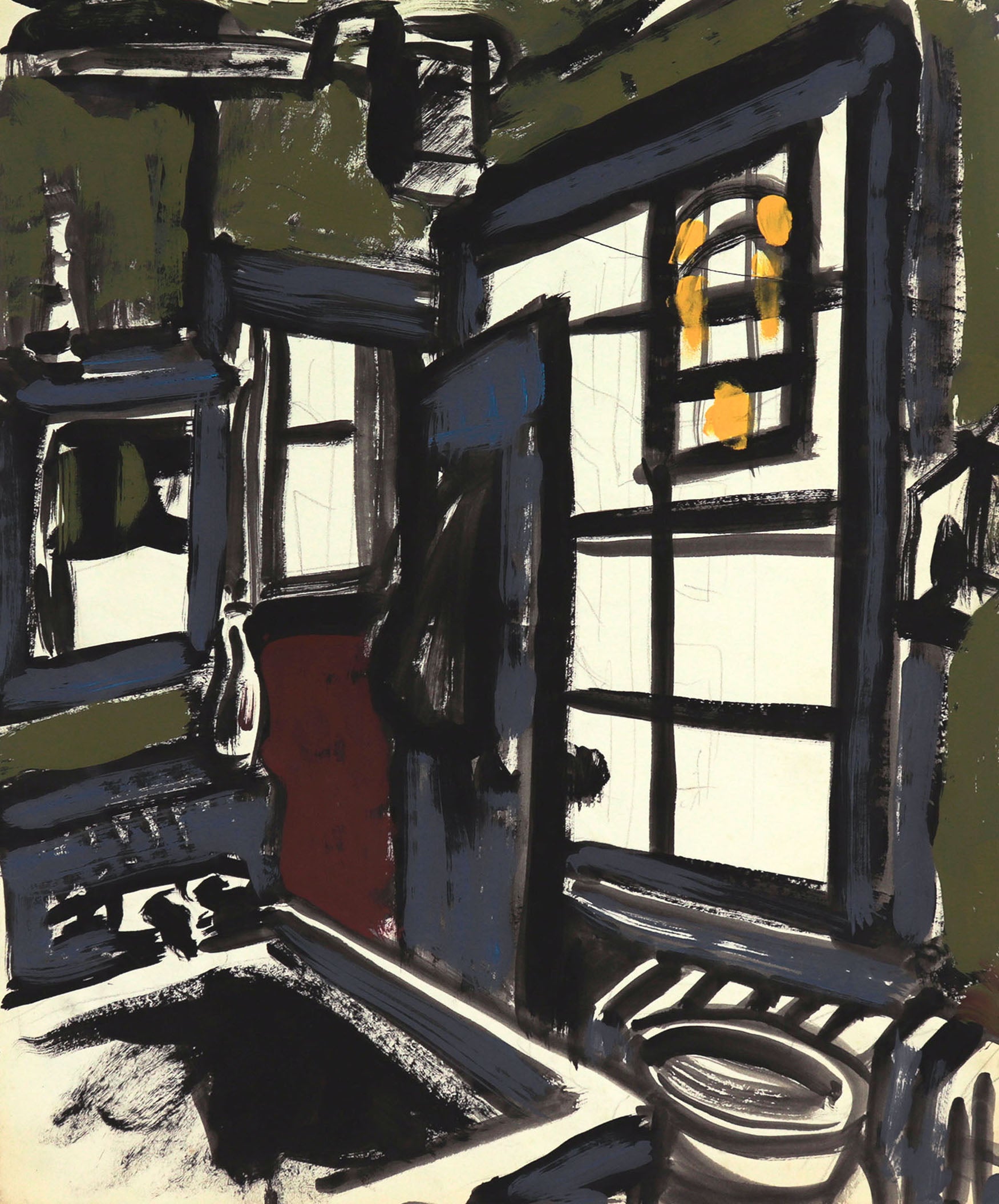 Entitled Blue Room, this late 20th century acrylic on paper scene is by artist Mark Symczak (1954-2015). Symczak was a Pittsburgh-born painter whose 40-year career was cut too short. Educated at the Art Institute of Pittsburgh, his early work reflected the industrial landscapes of his youth, blending photo-realism with surrealist blur and density. After relocating to New York in 1982, his subject matter shifted toward human figures and urban life, deeply influenced by his work in theater set design in New York. Throughout the mid-1980s and 1990s, human subjects dominated the canvas. Scenes of people living in a tight metropolis were often depicted in a theater or nightclub setting. Despite their fragmented, cubist-like forms, the figures come together with the unity of a thoughtfully arranged ensemble. The excited energy of the stage and the warmth of collaboration can be felt in these scenes, even as his style turns toward the flat and angular line, often associated with the work of Max Beckmann. His late-career “Birds” series—formed through ink and collage—evokes quiet introspection and was inspired in part by his mother’s love of birds and his own experience with illness. Symczak’s work has been exhibited in galleries throughout the U.S., and remains notable for its expressive use of color, evolving visual language, and the artist’s curiosity about the worlds around him.