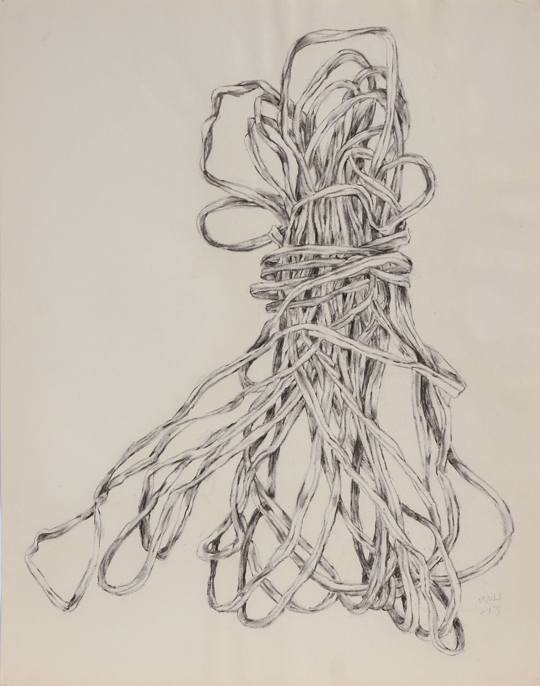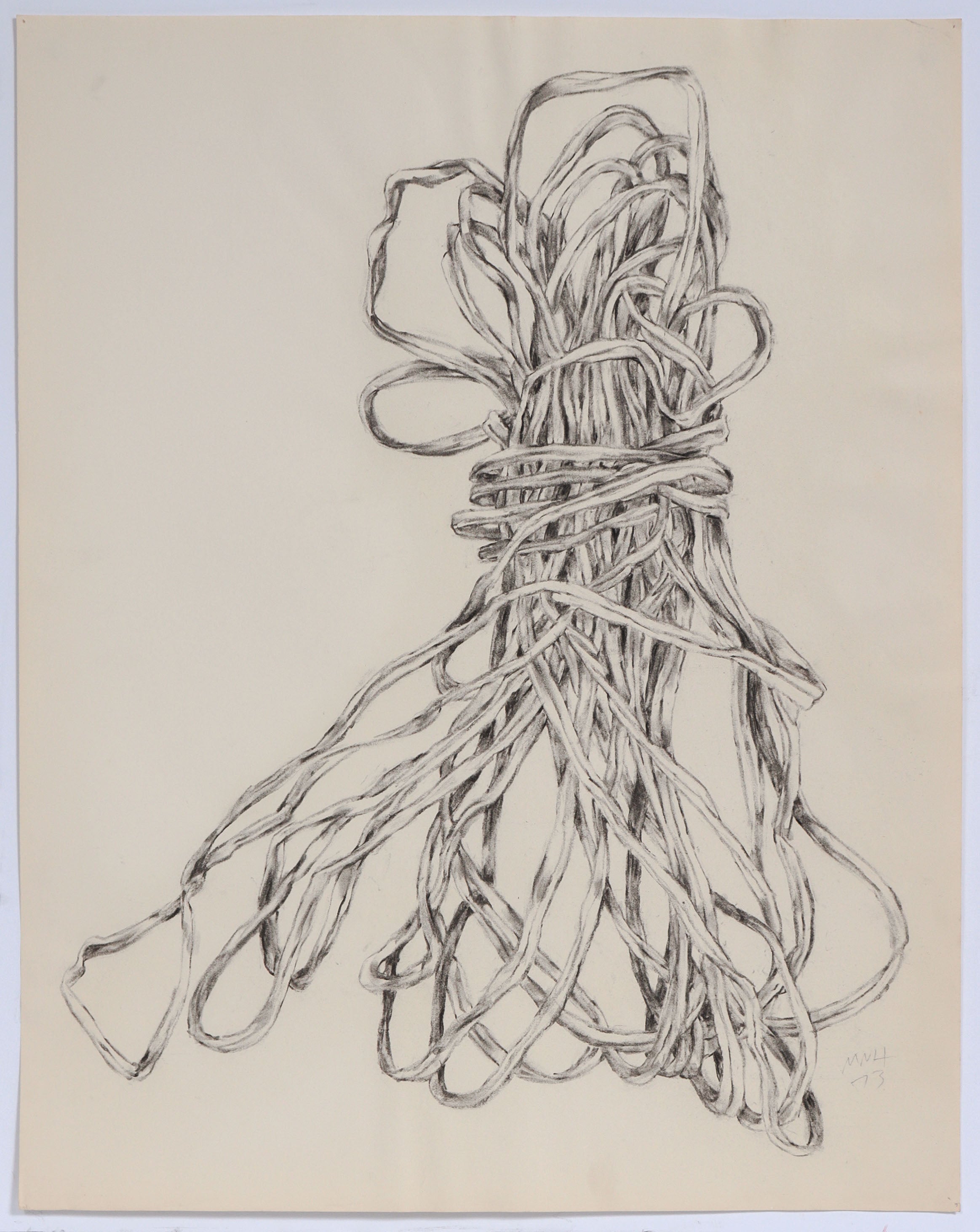 This 1973 charcoal on paper drawing is by the artist Leigh Hyams (1926-2013). Leigh Hyams, aka Martha Mae Nickerson, Martha Bolling, and Martha Hyams, was an acclaimed painter and teacher whose career spanned several decades and continents. Based in San Francisco from 1974 to 2000, she later made her home in San Miguel de Allende, Mexico, where she continued to paint and teach until her passing.