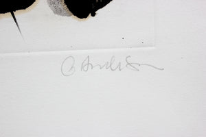 This late 20th-early 21st century abstract print with bold monochromatic strokes entitled Typhoon is by Bay Area painter, printmaker, and designer Calvin Anderson (1925-2023). He studied at CCAC and Art Center College in the 1940s and worked as a commercial art director in San Francisco for 40 years. Anderson created graphics for the SF Ballet for 20 years, and two of his poster designs are in the permanent collection at SFMOMA. Anderson taught Design at SFAI in the 1960s. He was a prolific printmaker in the 1990s-2000s, creating hundreds of minimal, abstract compositions drawing from his love of Modernism and design.