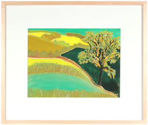 Entitled By The Pond this 2018 gouache and watercolor on paper plein-air landscape scene of Red Wood Valley, Mendocino, California is by contemporary Mendocino/Bay Area artist, Gaétan Caron (b. 1964), co-founder of Lost Art Salon in San Francisco. Caron's work is inspired by his surroundings and life in the mountains of inland Mendocino County, Northern California.