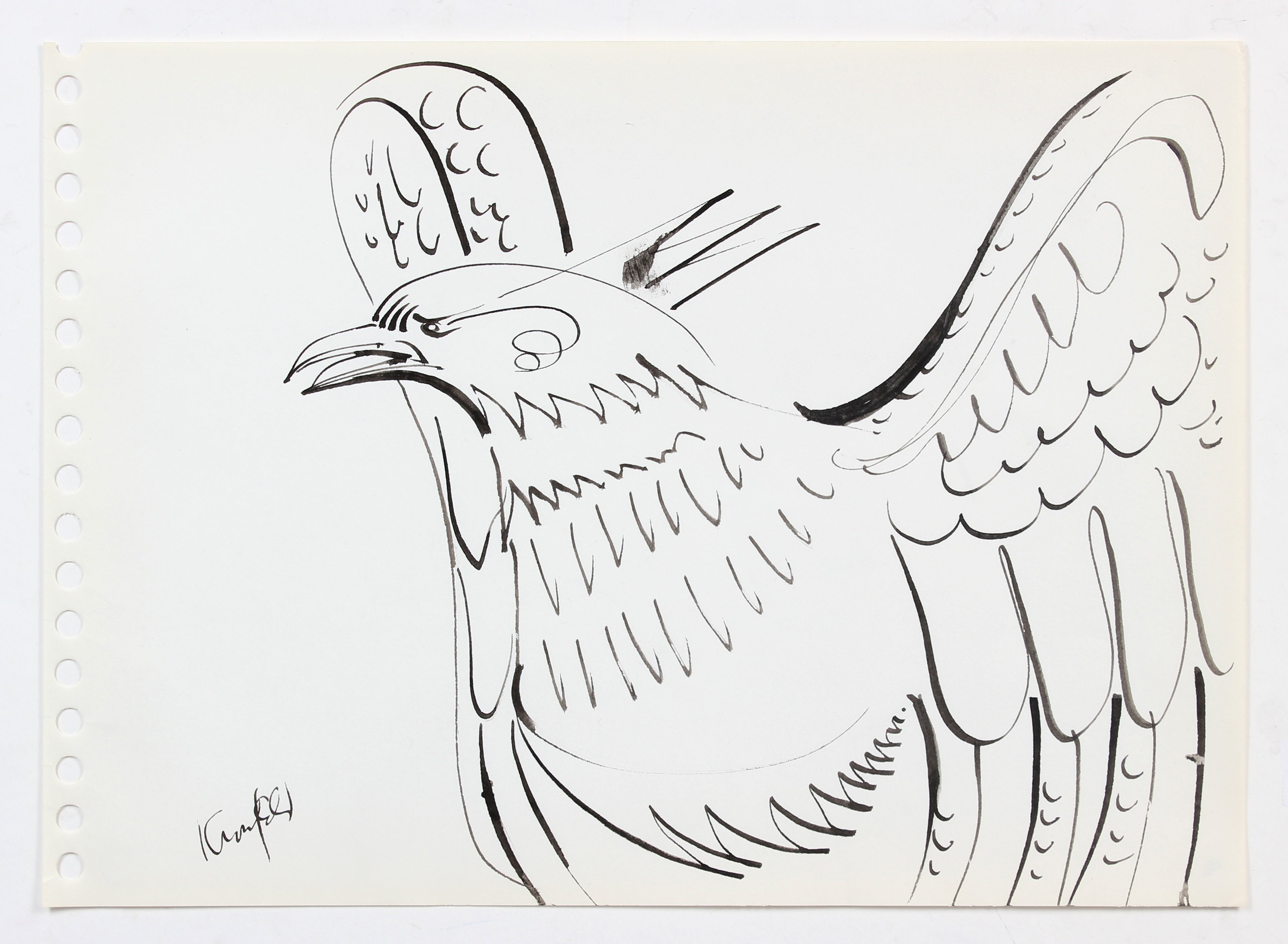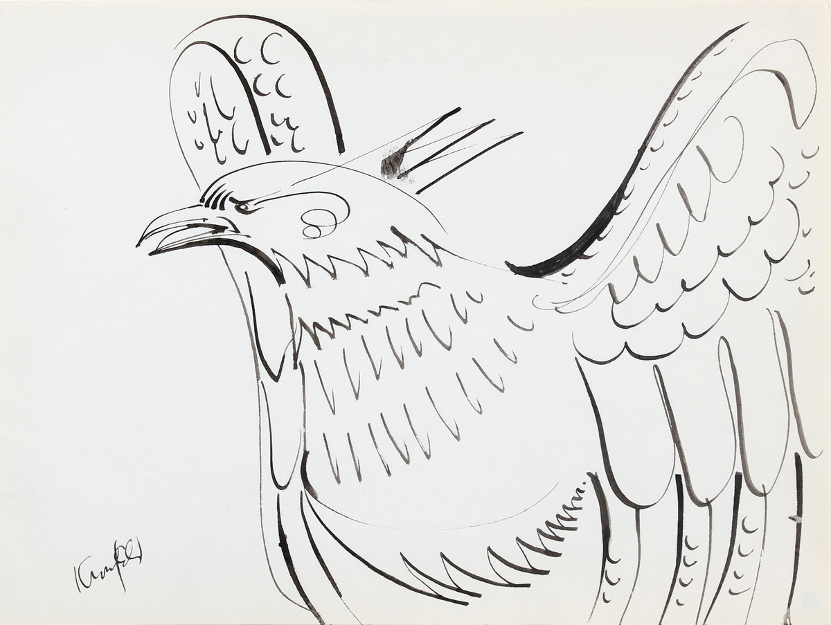 This circa 1960s-70s ink on paper drawing is by Morris Kronfeld (1914-2011), a New York Modernist artist. He studied art, biology, & art history at Brooklyn College and received a master's degree at NYU. An art teacher and district art supervisor, Kronfeld had a lifelong career with the NYC Board of Education. He traveled extensively every summer, painting & drawing, and exhibited in Brooklyn and Greenwich Village.