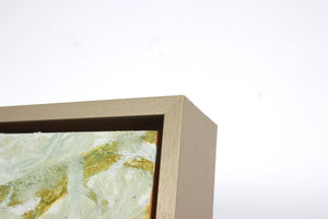 Signed lower right, signed and dated on the back. Framed in a contemporary wood floater frame with a gray face and black sides and interior. Excellent condition.
