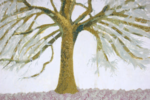 This 2019 oil on canvas abstracted Mendocino, California landscape with tree is entitled Silvery Sage Lichen and Moss by contemporary Mendocino/Bay Area artist, Gaétan Caron (b. 1964), co-founder of Lost Art Salon in San Francisco. Caron's work is inspired by his surroundings and life in the mountains of inland Mendocino County, Northern California.