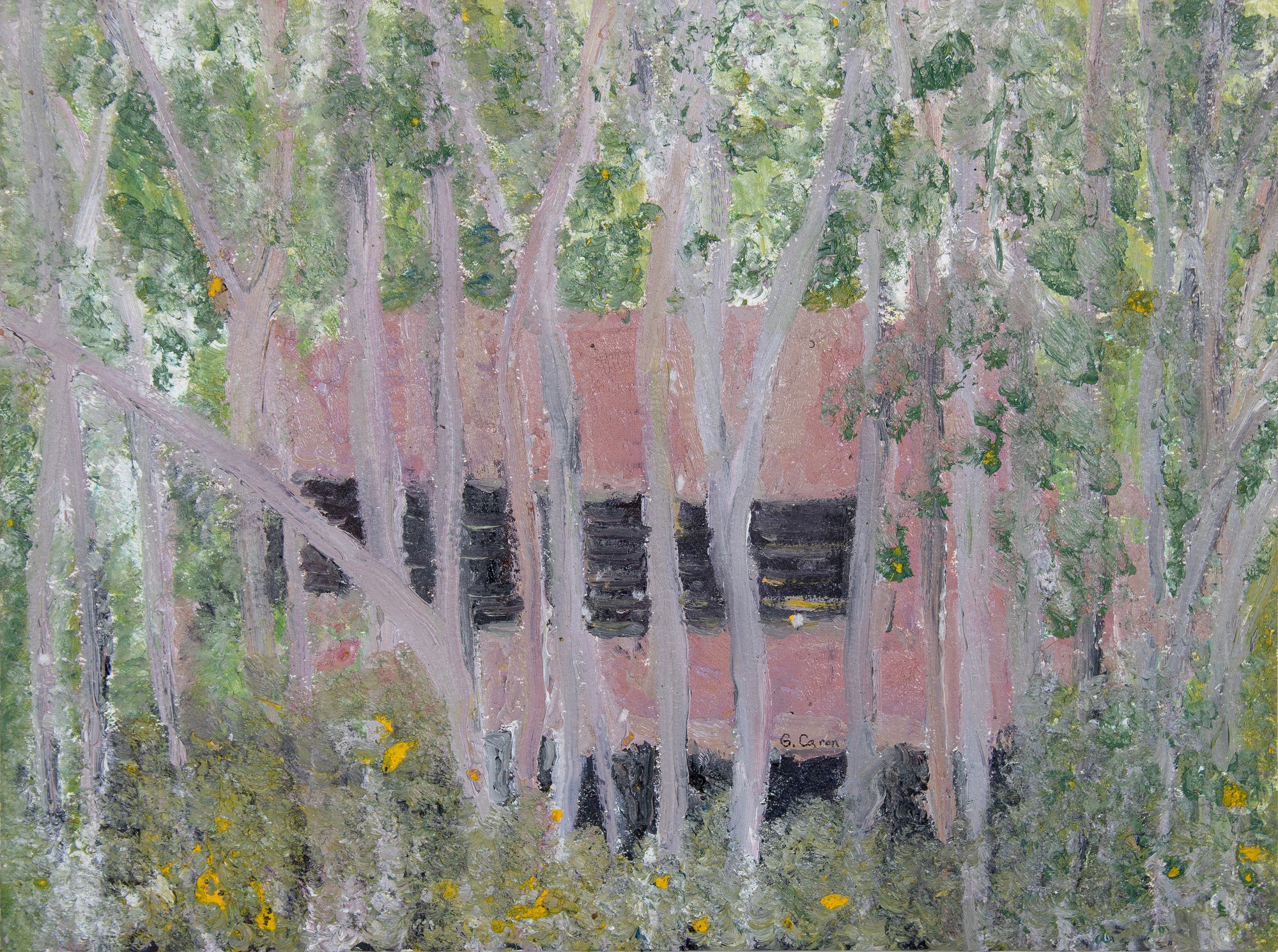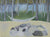 Entitled Lake Pillsburg, this 2019 acrylic and walnut oil on paper abstracted scene of Lake Mendocino, California is by contemporary Mendocino/Bay Area artist, Gaétan Caron (b. 1964), co-founder of Lost Art Salon in San Francisco. Caron's work is inspired by his surroundings and life in the mountains of inland Mendocino County, Northern California.