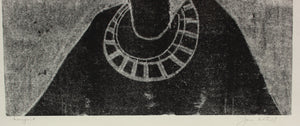 This 1970-80s abstracted portrait monotype on paper is by East Coast painter, printmaker, and designer Jane Mitchell (1915-1988). Mitchell studied Art History and Fine Art at Wheaton College and University of Iowa. She lived and worked in Ibiza, Spain during the 1950s-60s and was influenced by Cubism and Surrealism. Mitchell exhibited throughout the U.S. and Spain during her lifetime.