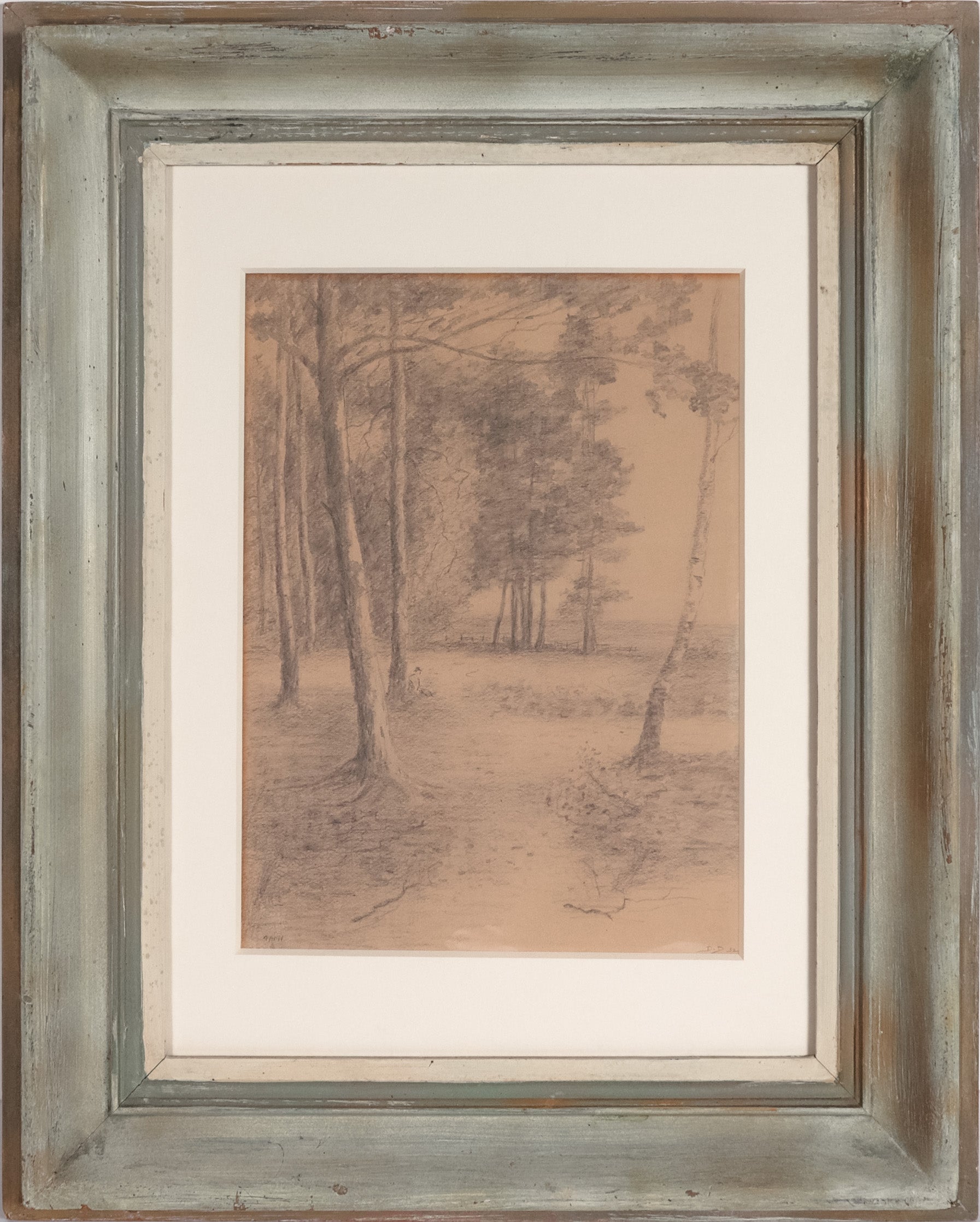 This early 20th century oil on board forest landscape scene is by native of Indiana artist Elizabeth L. Baum. Baum studied at Indiana University under Robert Burke and Harry Engle and attended The Academy of Art (Chicago) and the Chicago Art Institute. She studied privately under Claude Curry Bohm, in Brown County, and under Homer G. Davisson, in Somerset.