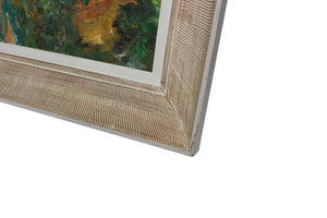 Framed in a restored vintage wood wide-faced textured frame in a grey finish. Signed, titled and dated on back. Excellent vintage condition.