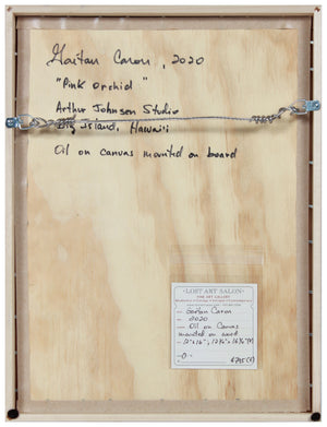 Entitled Pink Orchid this 2020 oil on canvas mounted to wood abstract Hawaiian flower still life is by contemporary Mendocino/Bay Area artist, Gaétan Caron (b. 1964), co-founder of Lost Art Salon in San Francisco. Caron goes to the Big Island of Hawaii every winter for an art residency at the Arthur Johnsen Tropical Studio.