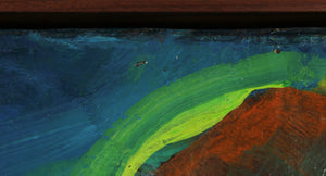 This 1977 acrylic on board abstracted landscape is by Derby, CT native Edith Park Truesdell (1888-1986). Truesdell lived for nearly a century as a noted painter, teacher, writer and poet. Her long life ran parallel to that of the first female American artist to achieve real fame; Georgia O’Keeffe. She was also the aunt, mentor and ally behind the seminal Bay Area Figurative painter, David Park (1911-1960), and her work profoundly influenced her nephew’s creative development. Truesdell was trained at the Boston Museum School under American Impressionists, Frank Weston Benson and Edmund C. Tarbell. Her deep engagement with figurative and landscape painting brought her solo shows at the Boston Museum, UCLA, the Copley Gallery in Boston, the Denver Public Library, the Monterey Peninsula Museum, the Carmel Art League, and a 1979 one-woman exhibition at the Pat Carey Gallery in San Francisco. She was an important member of The California Art Club and exhibited with members of L.A.’s progressive “Group of Eight”.