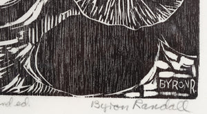 Entitled Daisys, Holly, Mellon, this mid 20th century expressive woodcut on paper still life is by Expressionist West Coast artist Byron Randall (1918-1999). His work is held in permanent collections of the Phillips Collection, the California Palace of the Legion of Honor, the Montreal Museum of Fine Arts, and the Oakland Museum of California. Randall traveled the world as a Merchant Marine during WWII. He lived in Mendocino, CA during the 1960s with his wife, Emmy Lou Packard, where they ran a guesthouse and art gallery.