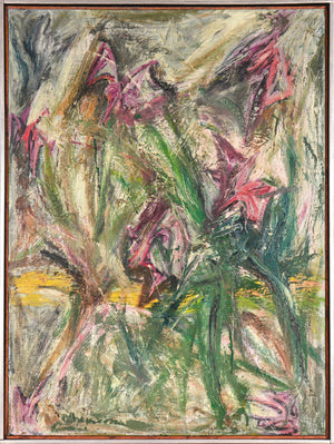 Entitled Wild Orchid, this 1961 oil and acrylic on canvas abstracted floral still life is by self-taught New York and L.A. artist Dan Abramson (1923-2012). During the 1960s, he was considered a "Mad Man," creating iconic commercial illustrations. His first solo show took place in New York City, NY, in 1961, and he participated in group shows with contemporaries such as Rauschenberg, Warhol, Jasper Johns & Jim Dine. He temporarily retreated from the art world in 1967, reemerging as a visual artist in the late 1980s in Los Angeles, CA. He worked with assemblage and decorative arts, transitioning later to works on paper: collages & manipulated images. His later works were produced in Casa Effie (his artist's home in Silverlake, California). He was represented by Louis Stern Fine Arts in West Hollywood for a decade and had many solo & group shows.
