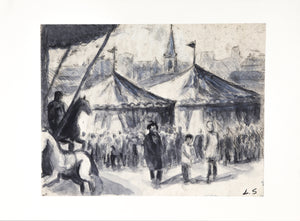 This 1946 ink on paper figurative abstract depicting an outdoor circus scene is by Russian-born artist Leo Saal (1912-1996). Saal was born in Petrograd (now Saint-Petersburg), Russia shortly before the Bolshevik Revolution. He endured three years in The Gulag, and was captured by Germany during WWII. He worked in the circus and theater and was trained in photography and filmmaking. He moved to Washington DC when he was invited to work for the CIA in 1953. Throughout all this, and over six decades, Saal managed to draw, sketch, do printmaking, make collages and paint - often inspired by early references to turn-of-the-century Russian paintings. Recurring themes were frequently related to European history, the circus metaphor, mother and child, and the beach. Saal was primarily self-taught and created thousands of pieces with strong influences from Beckman, Picasso, Manet, Feininger, Velasquez and Goya.