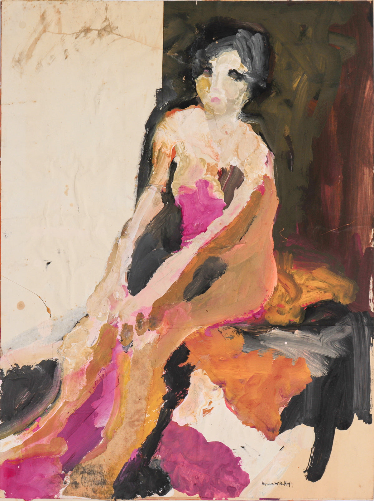 Entitled Lorelai, this mid 20th century distemper on paper is by Bay Area artist Alysanne McGaffey (1931-2018). Born in Seattle, McGaffey moved to San Francisco in the mid 1950s to study at SFAI with Bay Area Figurative pioneers Joan Brown, Nathan Oliveira, Jay DeFeo, Bruce McGaw, and Manuel Neri. McGaffey also took classes at CCAC and UC Berkeley, and received an MFA in Painting from the University of San Francisco. She became involved in community arts organizations, holding offices in several, including the Coastal Arts League and Pacifica's Cultural Arts Commission. Eventually McGaffey's gaze moved from the figure to the landscape, and she spent the last thirty years traveling the Northern California coast painting watercolor seascapes.