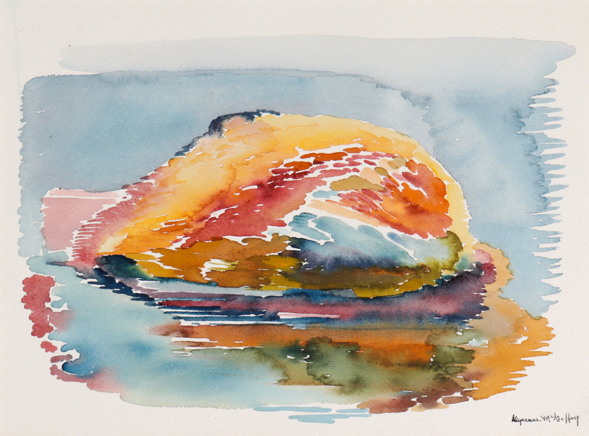 This late 20th Century watercolor on paper painting is by Bay Area artist Alysanne McGaffey (1931-2018). Born in Seattle, McGaffey moved to San Francisco in the mid 1950s to study at SFAI with Bay Area Figurative pioneers Joan Brown, Nathan Oliveira, Jay DeFeo, Bruce McGaw, and Manuel Neri. McGaffey also took classes at CCAC and UC Berkeley, and received an MFA in Painting from the University of San Francisco. She became involved in community arts organizations, holding offices in several, including the Coastal Arts League and Pacifica's Cultural Arts Commission. Eventually McGaffey's gaze moved from the figure to the landscape, and she spent the last thirty years traveling the Northern California coast painting watercolor seascapes.