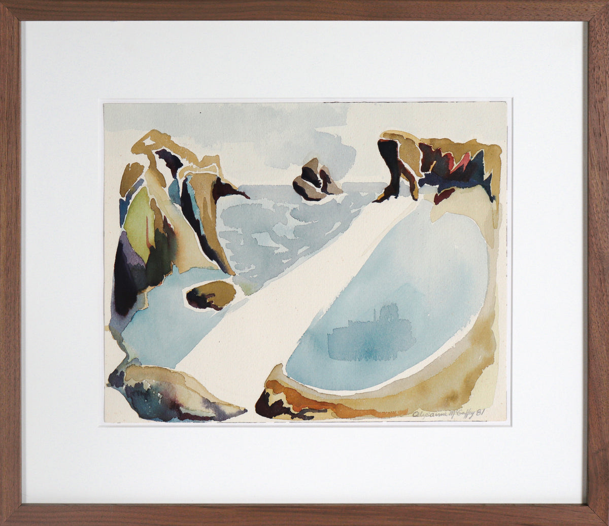 This 1981 watercolor on paper seascape is by Bay Area artist Alysanne McGaffey (1931-2018). Born in Seattle, McGaffey moved to San Francisco in the mid 1950s to study at SFAI with Bay Area Figurative pioneers Joan Brown, Nathan Oliveira, Jay DeFeo, Bruce McGaw, and Manuel Neri. McGaffey also took classes at CCAC and UC Berkeley, and received an MFA in Painting from the University of San Francisco. She became involved in community arts organizations, holding offices in several, including the Coastal Arts League and Pacifica's Cultural Arts Commission. Eventually McGaffey's gaze moved from the figure to the landscape, and she spent the last thirty years traveling the Northern California coast painting watercolor seascapes.