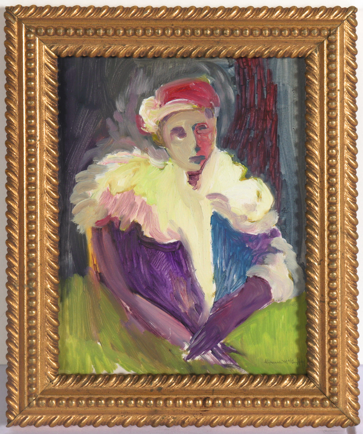 This late mid-late 20th century oil on paper portrait is by Bay Area artist Alysanne McGaffey (1931-2018). Born in Seattle, McGaffey moved to San Francisco in the mid 1950s to study at SFAI with Bay Area Figurative pioneers Joan Brown, Nathan Oliveira, Jay DeFeo, Bruce McGaw, and Manuel Neri. McGaffey also took classes at CCAC and UC Berkeley, and received an MFA in Painting from the University of San Francisco. She became involved in community arts organizations, holding offices in several, including the Coastal Arts League and Pacifica's Cultural Arts Commission. Eventually McGaffey's gaze moved from the figure to the landscape, and she spent the last thirty years traveling the Northern California coast painting watercolor seascapes.