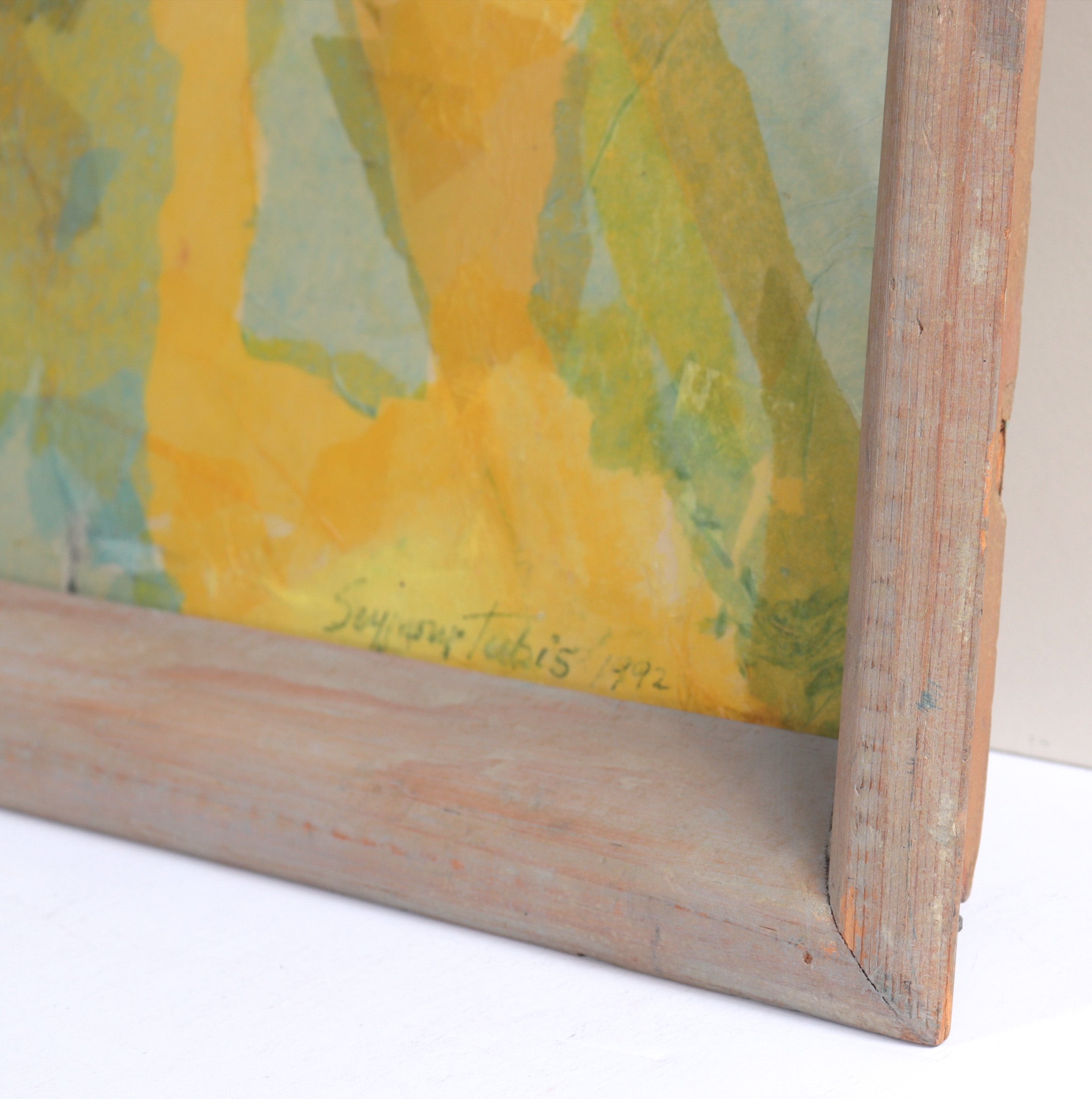 This 20th century papier collé on board, is by Santa Fe artist Seymour Tubis (1919-1993). Tubis studied at the Art Students League with Hans Hofmann (1946-1949). He exhibited in Paris in 1950 and won praise from Georges Braque. He was Chair of the Fine Art Department at the Institute of American Indian Arts in Santa Fe (1963-1980).