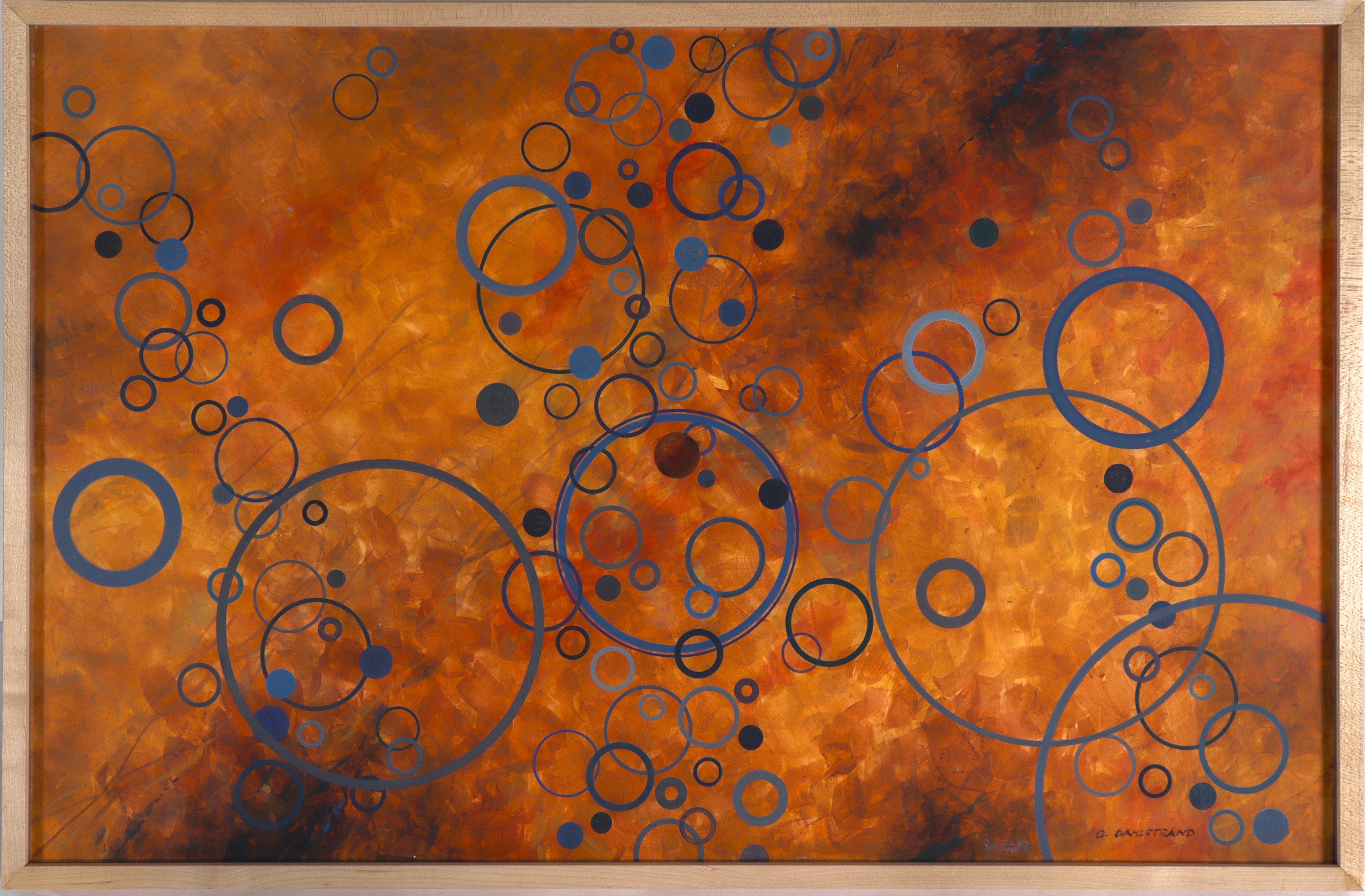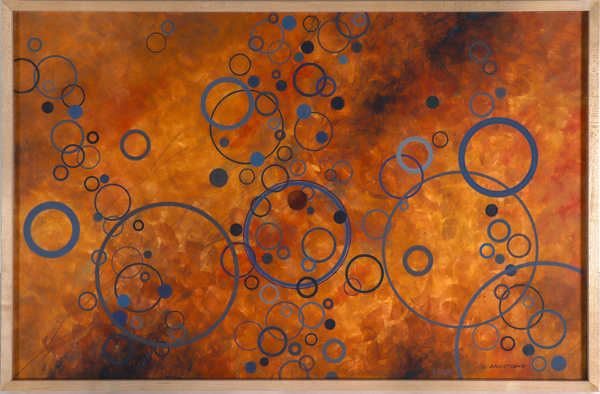 Entitled The Red Dwarf, this 20th century geometric abstract acrylic on board is by Olof Dahlstrand (1916-2014) who joined Carmel Art Association in 1984. Dahlstrand (1916-2014) received a Bachelor of Architecture from Cornell University in 1939. He is considered a canonical figure in the conception and execution of significant works of the golden age of California Modernism. As a fine artist, he drew and painted throughout his life and then continuously after he retired in 1984. Exhibition highlights include: Milwaukee Art Institute, San Francisco Museum of Art, and the Monterey Peninsula Museum of Art. He joined the Carmel Art Association in 1984. He was also a member of the Board of Trustees for Monterey Peninsula Museum of Art. An avid outdoorsman and explorer of rural California, much of his work skillfully captures the natural beauty of the West Coast with a stunning sense of realism and accuracy. Late in life he turned to abstraction, and his compositions reflect an architect’s interest in geometry and order.