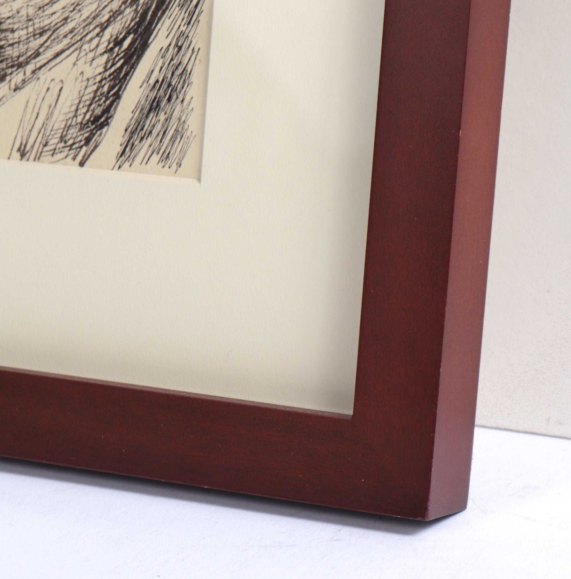 Signed Lower left. Excellent vintage condition. Framed in a solid wood frame with a cherry finish using archival matting and clear archival spacers behind conservation clear glass.