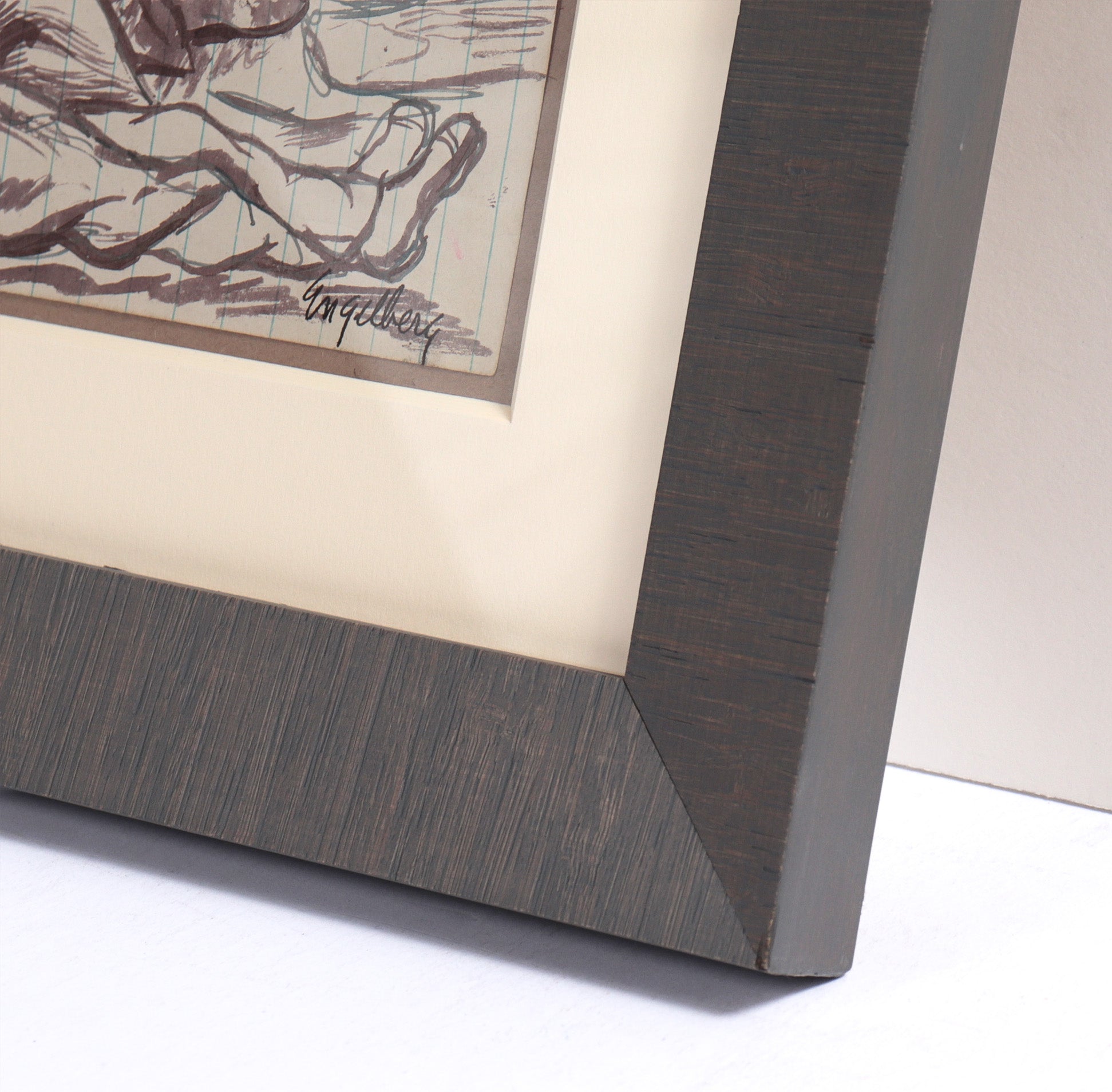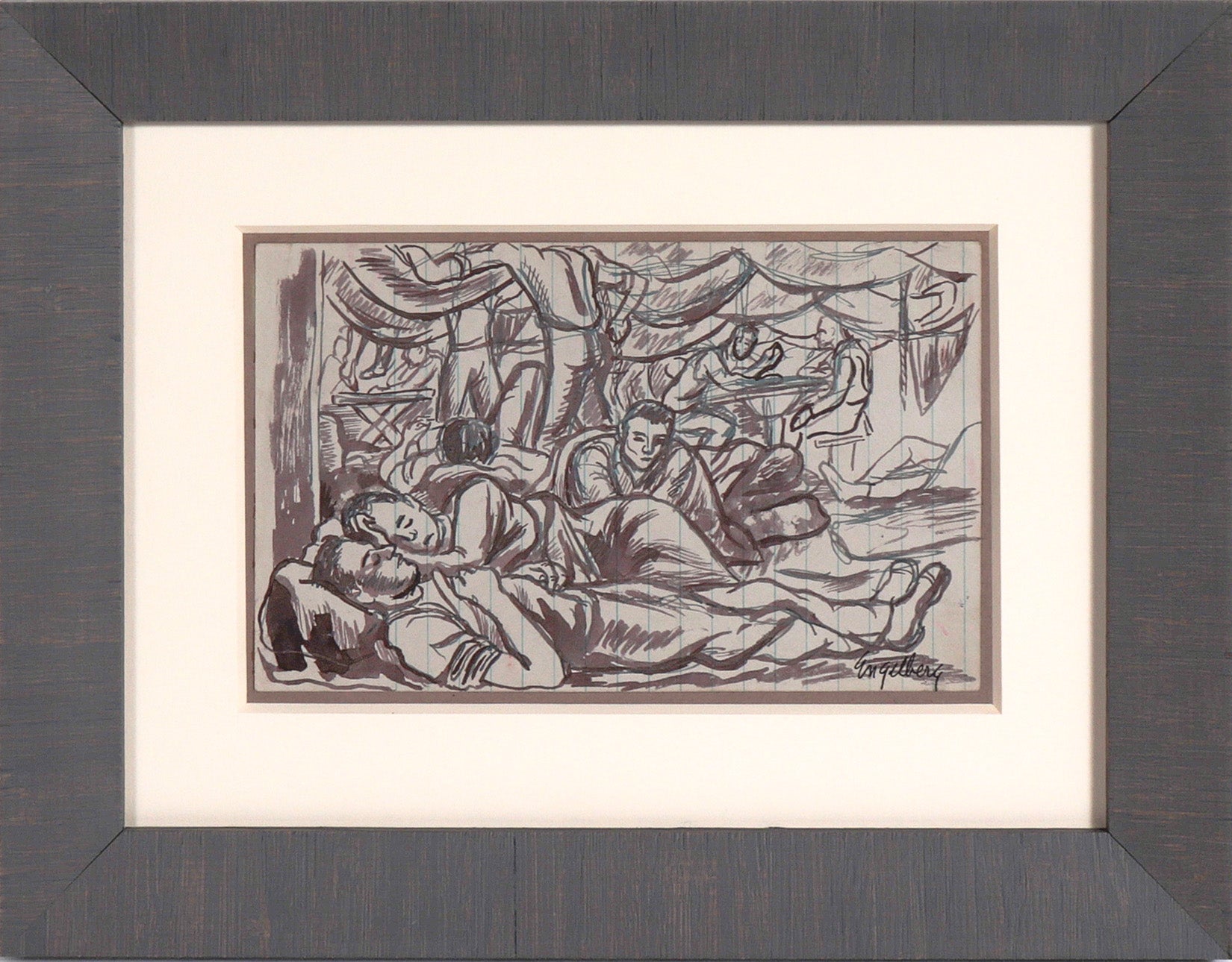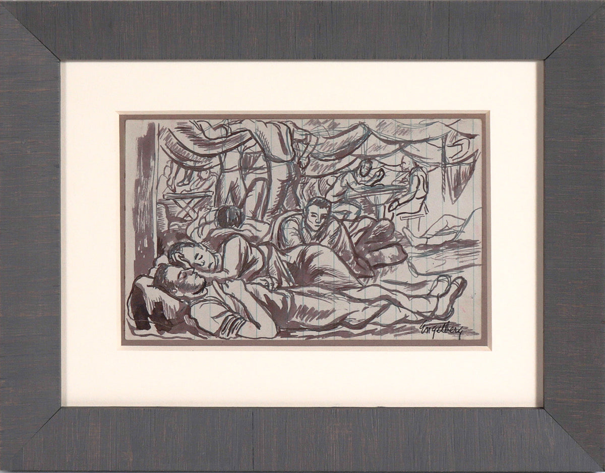 Entitled Below Decks, this 1942 ink on paper drawing is by Sydney Engelberg (1912-1997). Engelberg was a painter and illustrator who primarily worked within the American Scene tradition during the first half of the 20th century. He blended aspects of Regionalism, Social Realism, and occasionally Magic Realism to create uniquely American narratives. Active during the peak of American Scene painting, Engelberg was a contemporary—and at times a student—of the movement’s key artist, Thomas Hart Benton (1889–1975). Engelberg combined the more conservative Regionalism with elements of the left-leaning Social Realism, while also occasionally incorporating the surreal, dreamlike qualities of Magic Realism. Most of Engelberg’s work was created during his active service in WWII and through his illustrations for The New Yorker magazine, both before and after the war. However, like the mischievous harlequins that appear and disappear throughout his oeuvre, Engelberg hid a secret: he was a closeted gay man until he met his lifelong partner in the early 1950s. His hidden identity would influence how he experienced and depicted the "American Scene," both at home and at war.