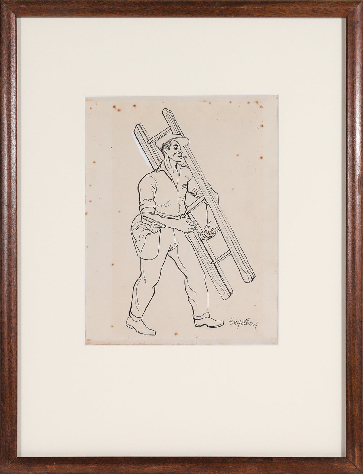 This 1930's ink and gouache on paper drawing is by Sydney Engelberg (1912-1997). Engelberg was a painter and illustrator who primarily worked within the American Scene tradition during the first half of the 20th century. He blended aspects of Regionalism, Social Realism, and occasionally Magic Realism to create uniquely American narratives. Active during the peak of American Scene painting, Engelberg was a contemporary—and at times a student—of the movement’s key artist, Thomas Hart Benton (1889–1975). Engelberg combined the more conservative Regionalism with elements of the left-leaning Social Realism, while also occasionally incorporating the surreal, dreamlike qualities of Magic Realism. Most of Engelberg’s work was created during his active service in WWII and through his illustrations for The New Yorker magazine, both before and after the war. However, like the mischievous harlequins that appear and disappear throughout his oeuvre, Engelberg hid a secret: he was a closeted gay man until he met his lifelong partner in the early 1950s. His hidden identity would influence how he experienced and depicted the "American Scene," both at home and at war.