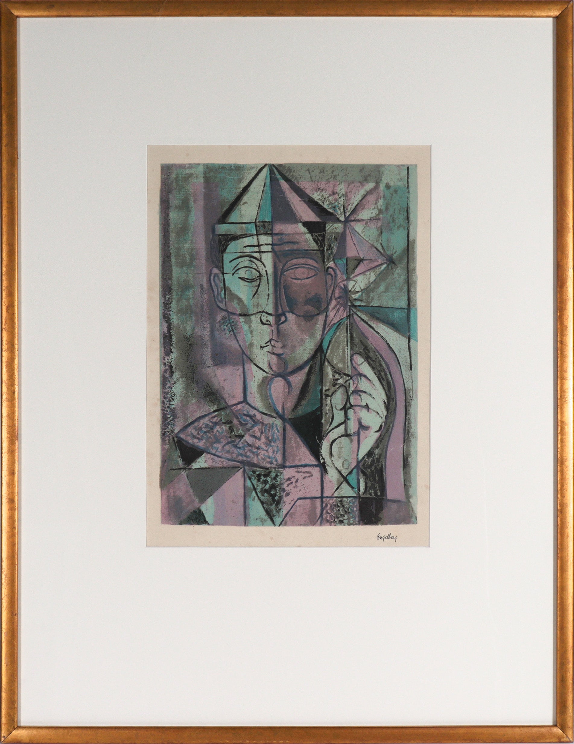 This 1930's lithograph harlequin print on paper is by Sydney Engelberg (1912-1997). Engelberg was a painter and illustrator who primarily worked within the American Scene tradition during the first half of the 20th century. He blended aspects of Regionalism, Social Realism, and occasionally Magic Realism to create uniquely American narratives. Active during the peak of American Scene painting, Engelberg was a contemporary—and at times a student—of the movement’s key artist, Thomas Hart Benton (1889–1975). Engelberg combined the more conservative Regionalism with elements of the left-leaning Social Realism, while also occasionally incorporating the surreal, dreamlike qualities of Magic Realism. Most of Engelberg’s work was created during his active service in WWII and through his illustrations for The New Yorker magazine, both before and after the war. However, like the mischievous harlequins that appear and disappear throughout his oeuvre, Engelberg hid a secret: he was a closeted gay man until he met his lifelong partner in the early 1950s. His hidden identity would influence how he experienced and depicted the "American Scene," both at home and at war.