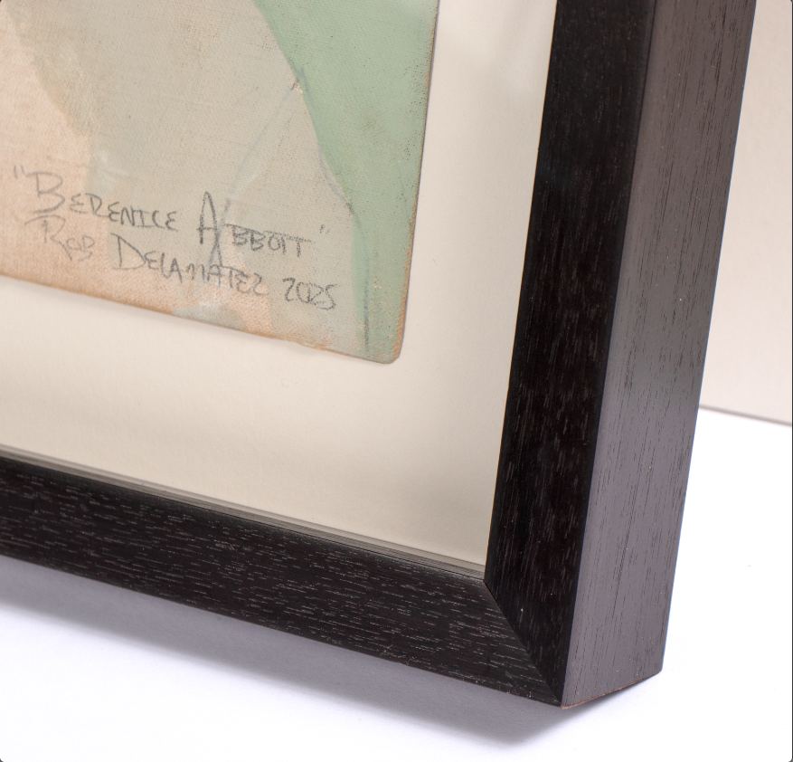 Entitled Berenice Abbott, this 2025 gouache and graphite on 19th century canvas paper is by San Francisco artist and Lost Art Salon co-owner Rob Delamater (b.1966).
