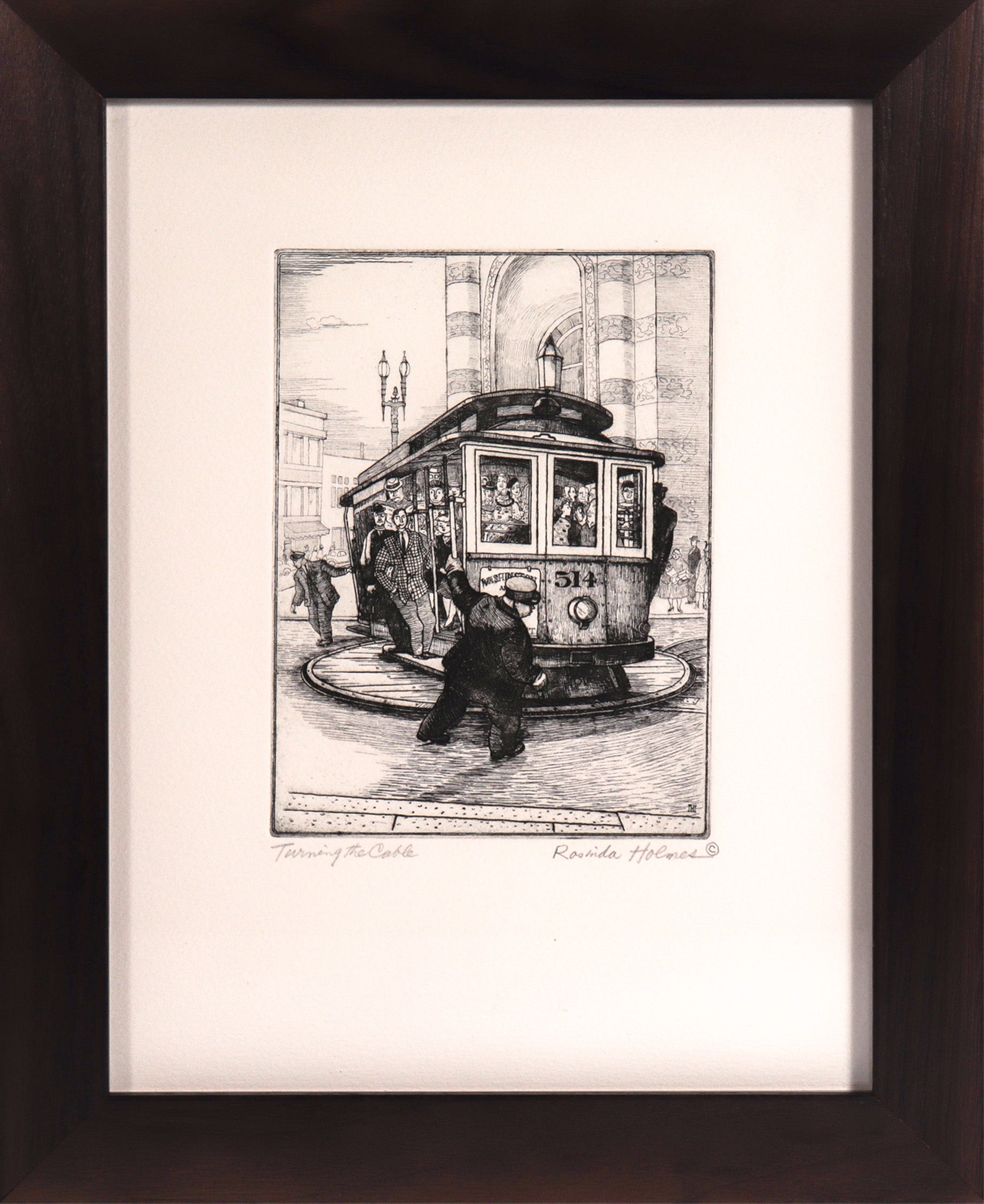 Entitled "Turning the Cable", this San Francisco cityscape etching is by Rosinda Holmes. Rosinda Holmes (born on March 6, 1917, in Rosedale, British Columbia, Canada) and Rexford Holmes (born on March 13, 1913, in Los Angeles, California) often worked in the same medium and style, capturing iconic images of SF and the Bay Area. Rexford studied at the Chouinard Art Institute in the late 1930s before settling in San Francisco in 1941, where he was active until 1958. During this period, he exhibited at prestigious venues such as the San Francisco Museum of Art and the California Palace of Legion of Honor. In 1942, Rosinda, after graduating from Chouinard Art Institute in 1940 and working in a San Diego advertising agency, married Rexford and moved with him to San Francisco, where they took up residence in Maynard Dixon's former studio (later the Melvin Belli office). In 1958, they moved to a prune farm near Healdsburg, California, Rexford and Rosinda lived and worked together in Healdsburg until her death in 2001. Rexford continued to reside in Healdsburg until his passing in 2009.