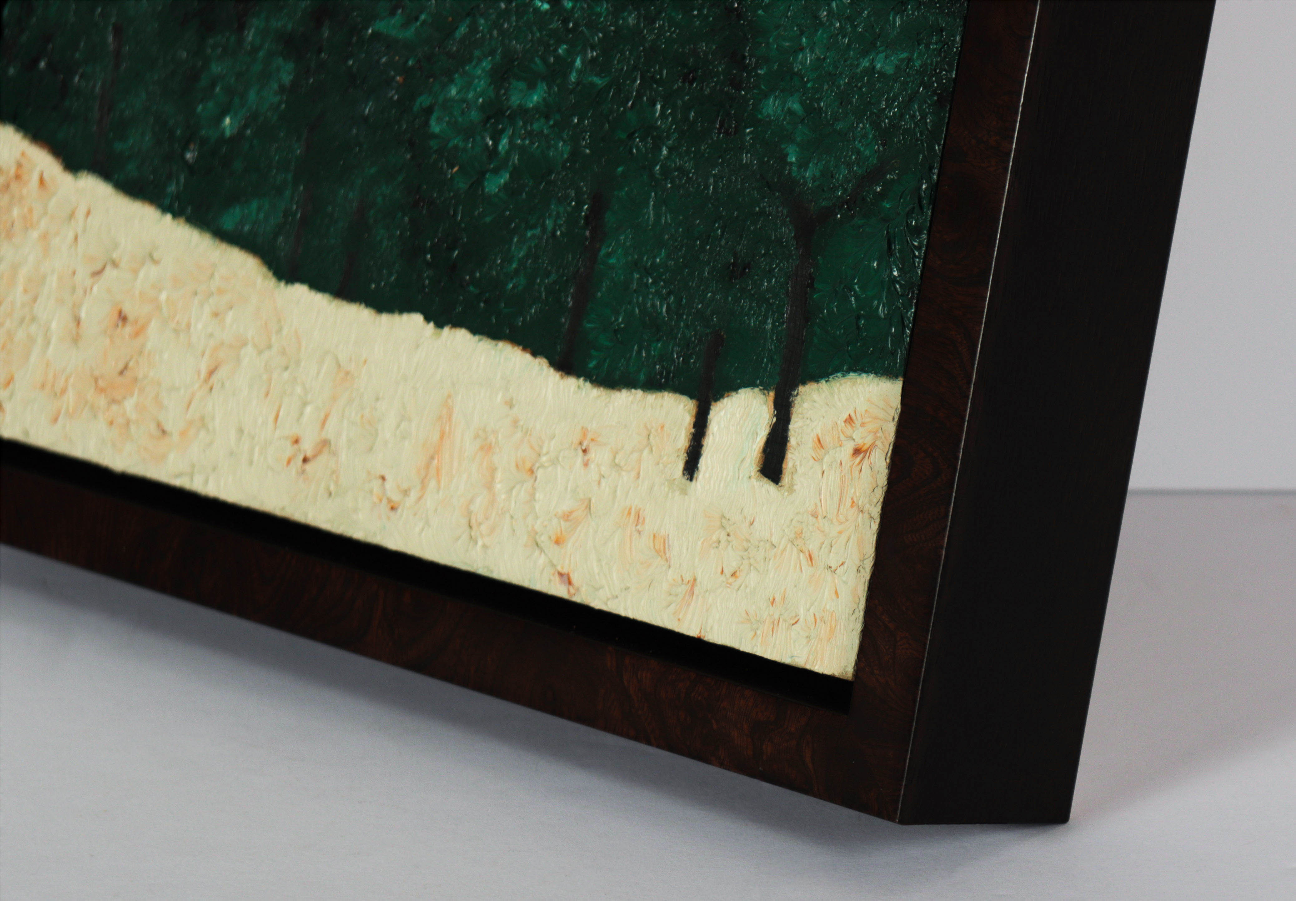 Signed, dated and titled on the back. Framed in a contemporary wood floater frame with an espresso finish. Excellent condition.