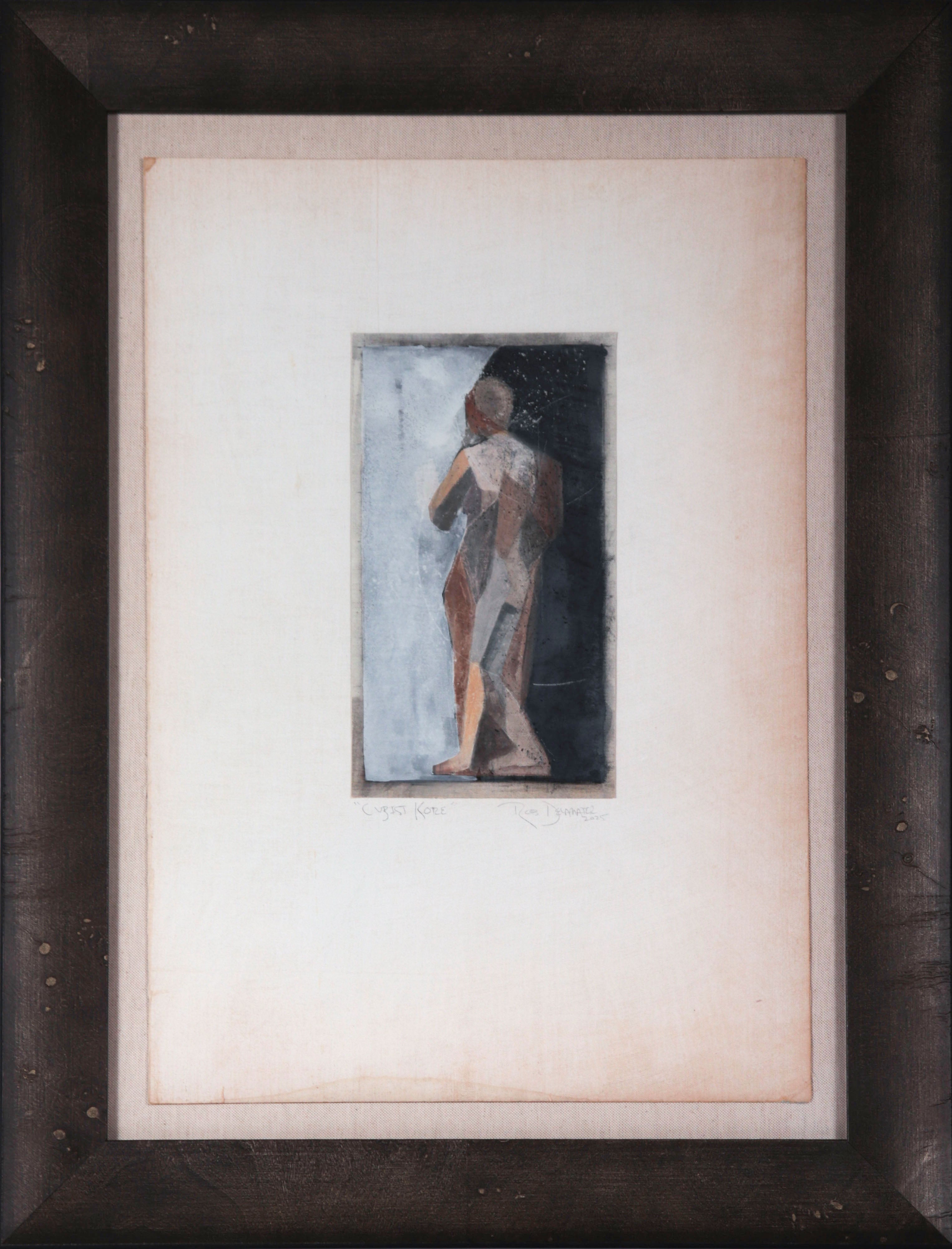 Entitled Cubist Kore, this 2025 gouache, chalk and charcoal figure on antique French canvas paper is by San Francisco artist and Lost Art Salon co-owner Rob Delamater (b.1966). Delamater creates abstract compositions that evoke organic shapes and motifs from the natural world. His works are created using various forms of printmaking, painting, and collage.