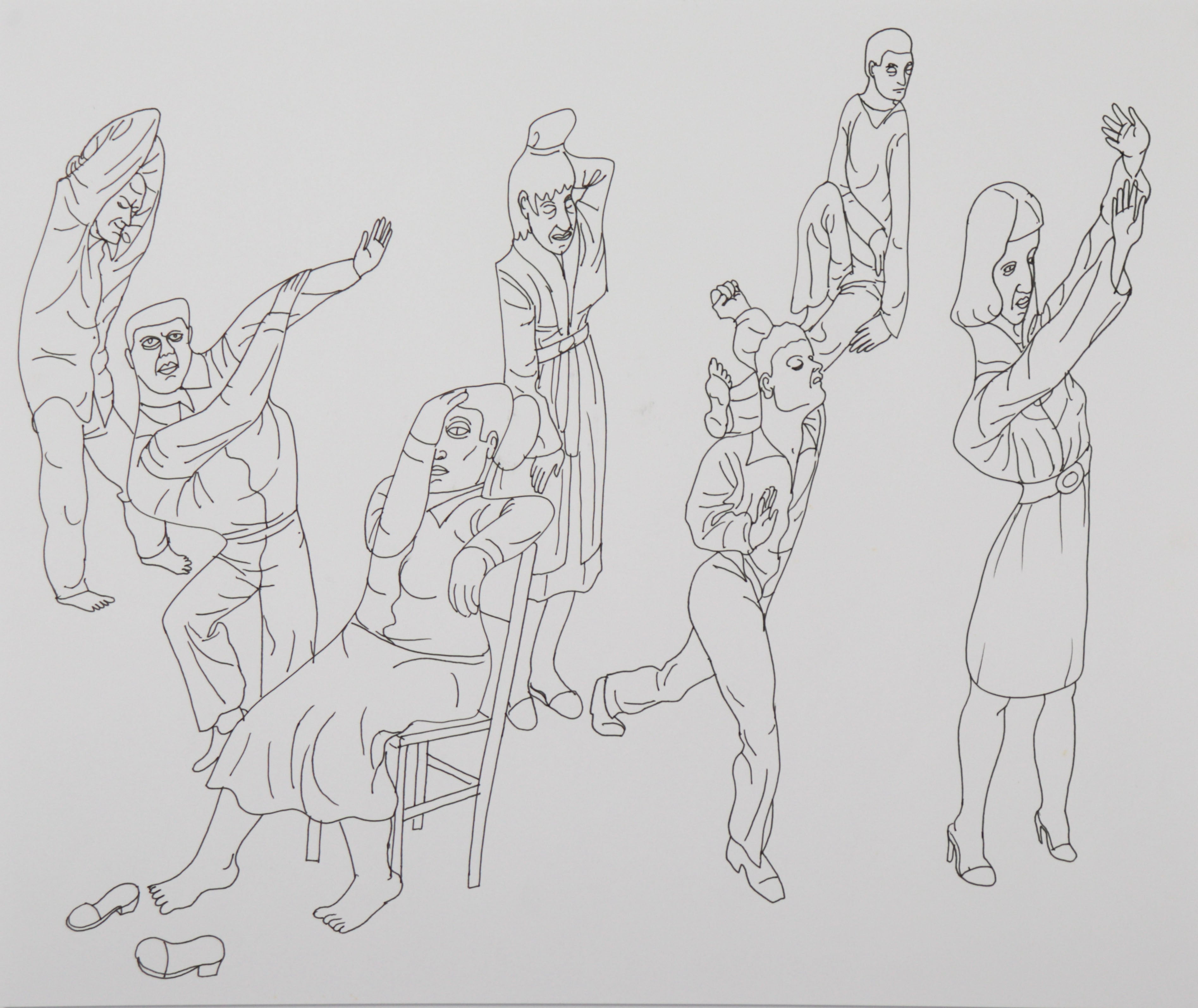 This late 20th century ink on paper is a minimal but expressive figure study by artist Mark Symczak (1954-2015). Symczak was a Pittsburgh-born painter whose 40-year career was cut too short. Educated at the Art Institute of Pittsburgh, his early work reflected the industrial landscapes of his youth, blending photo-realism with surrealist blur and density. After relocating to New York in 1982, his subject matter shifted toward human figures and urban life, deeply influenced by his work in theater set design in New York. Throughout the mid-1980s and 1990s, human subjects dominated the canvas. Scenes of people living in a tight metropolis were often depicted in a theater or nightclub setting. Despite their fragmented, cubist-like forms, the figures come together with the unity of a thoughtfully arranged ensemble. The excited energy of the stage and the warmth of collaboration can be felt in these scenes, even as his style turns toward the flat and angular line, often associated with the work of Max Beckmann. His late-career “Birds” series—formed through ink and collage—evokes quiet introspection and was inspired in part by his mother’s love of birds and his own experience with illness. Symczak’s work has been exhibited in galleries throughout the U.S., and remains notable for its expressive use of color, evolving visual language, and the artist’s curiosity about the worlds around him.